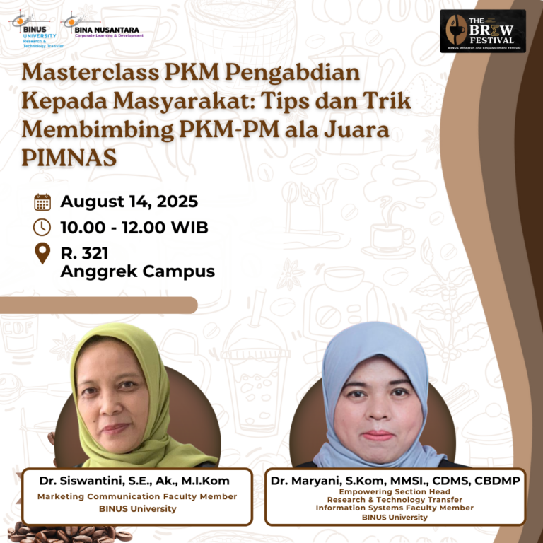 On August 14, 2025, BINUS University’s Department of Research and Technology Transfer (RTT), in collaboration with Binus Corporate Learning and Development (BCLND), hosted an online workshop titled “Masterclass PKM Pengabdian Kepada Masyarakat: Tips dan Trik Membimbing PKM-PM ala Juara PIMNAS.”