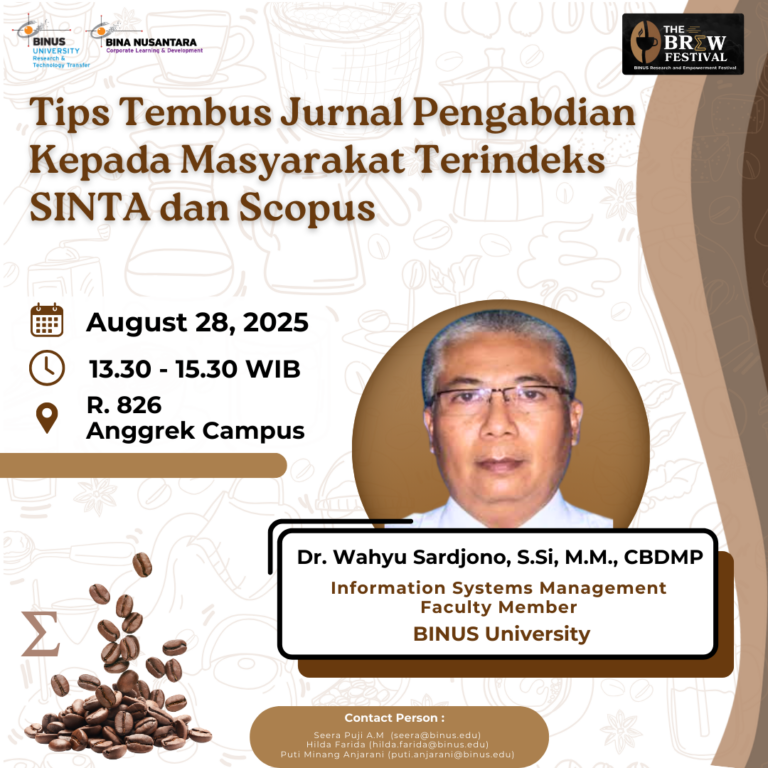 On 28 August 2025, the Department of Research and Technology Transfer (RTT) at BINUS University, in collaboration with Binus Corporate Learning and Development (BCLND) at the Syahdan Campus, successfully held a hybrid workshop entitled “Tips Tembus Jurnal Pengabdian Kepada Masyarakat Terindeks SINTA dan Scopus.” The workshop featured insightful coaching sessions delivered by distinguished speakers, including Dr. Wahyu Sardjono, S.Si, M.M., CBDMP, a faculty member in Information Systems Management at BINUS University.