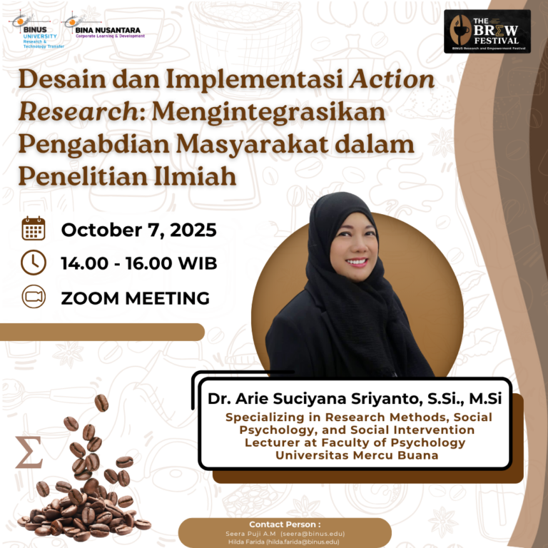 On October 7, 2025, the Department of Research and Technology Transfer (RTT) at BINUS University, in collaboration with Binus Corporate Learning and Development (BCLND), successfully organized an online workshop entitled “Desain dan Implementasi Action Research: Mengintegrasikan Pengabdian Masyarakat dalam Penelitian Ilmiah.” This event featured insightful coaching sessions delivered by distinguished speakers, notably Dr. Arie Suciyana Sriyanto, S.Si., M.Si., Lecturer at the Faculty of Psychology, Universitas Mercu Buana, who specializes in Research Methods, Social Psychology, and Social Intervention.