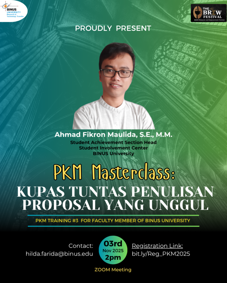 On November 03, 2025, the Department of Research and Technology Transfer (RTT) at BINUS University. Successfully organized an online workshop entitled “PKM Masterclass: Kupas Tuntas Penulisan Proposal yang Unggul”. The event featured comprehensive coaching sessions led by distinguished speakers, including Ahmad Fikron Maulida, S.E., M.M., Student Achievement Section Head, Student Involvement Center at BINUS University.