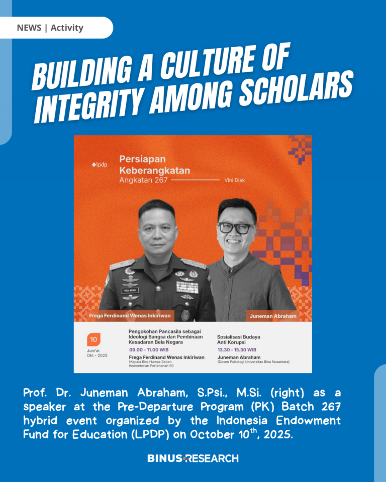 Pada Jumat, 10 Oktober 2025, Prof. Dr. Juneman Abraham, S.Psi., M.Si., Dosen Psikologi dan Wakil Rektor bidang Research & Technology Transfer BINUS University, menjadi narasumber dalam kegiatan Persiapan Keberangkatan (PK) LPDP Angkatan 267 yang diselenggarakan oleh Lembaga Pengelola Dana Pendidikan (LPDP). Dalam sesi bertema “Sosialisasi Budaya Anti Korupsi,” Prof. Juneman berbagi wawasan tentang pentingnya menanamkan integritas, tanggung jawab moral, dan nilai-nilai etika dalam diri penerima beasiswa agar mampu menjaga kejujuran dan berkontribusi positif bagi bangsa selama dan setelah menyelesaikan studi.