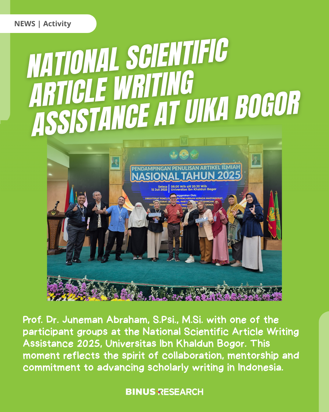 The National Scientific Article Writing Assistance program, held on 14–16 July 2025 at Universitas Ibn Khaldun Bogor, was organized by the Directorate General of Research and Development, Ministry of Higher Education, Science, and Technology in collaboration with UIKA. Bringing together approximately 80 lecturers from 40 universities across Indonesia, the program aimed to enhance academic productivity by strengthening scholarly writing skills and supporting the preparation of articles for reputable national and international journals. Among the facilitators was Prof. Dr. Juneman Abraham, S.Psi., M.Si. (vice rector of BINUS University – Research & Technology Transfer), who provided participants with valuable insights and mentoring throughout the sessions.
