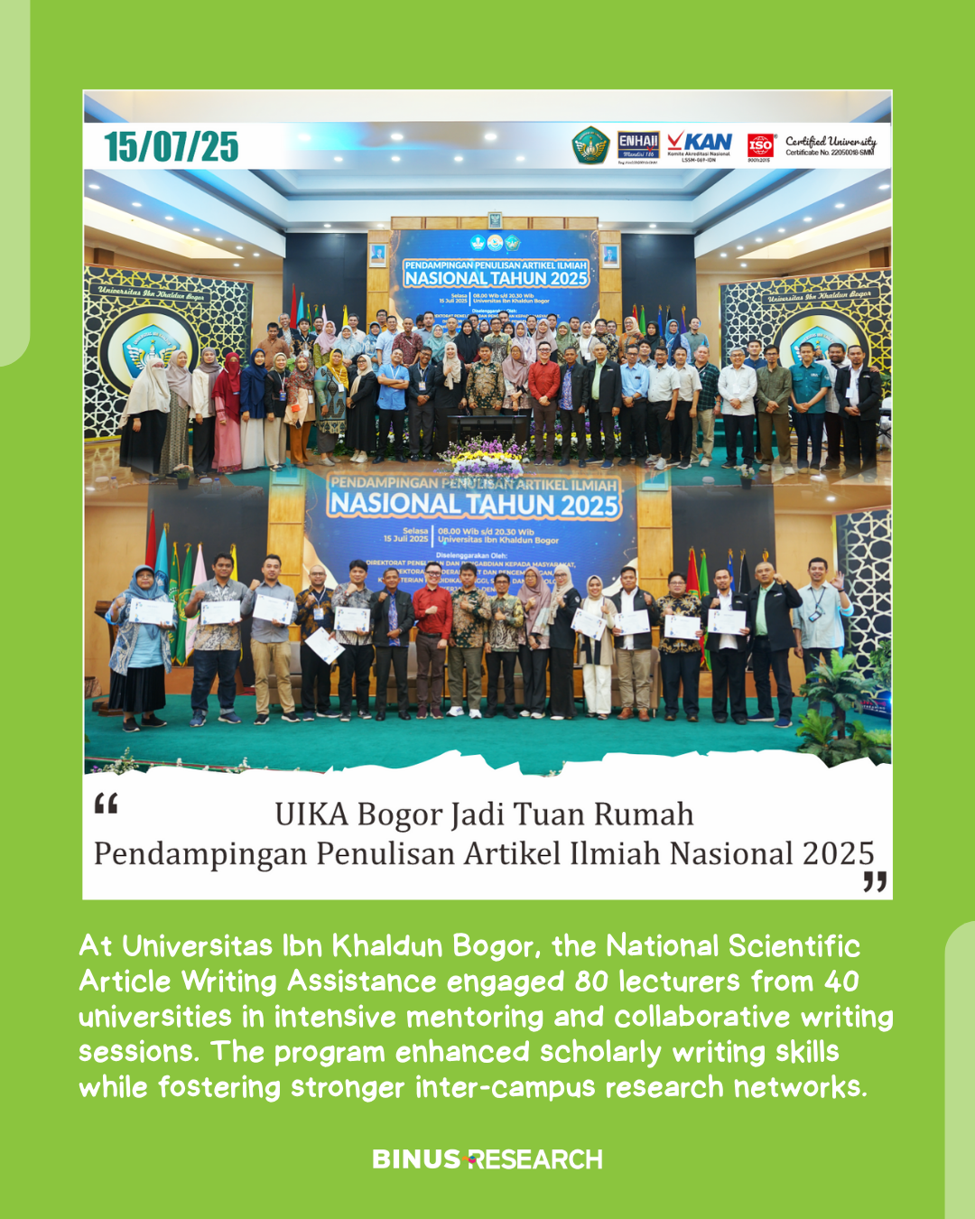 Kegiatan Pendampingan Penulisan Artikel Ilmiah Nasional diselenggarakan pada 14–16 Juli 2025 di Universitas Ibn Khaldun, Bogor, oleh Direktorat Jenderal Riset dan Pengembangan Kemdiktisaintek bekerja sama dengan UIKA. Acara ini diikuti sekitar 80 dosen dari 40 perguruan tinggi di Indonesia dengan tujuan memperkuat budaya akademik produktif, meningkatkan kualitas publikasi ilmiah, serta mendorong percepatan penulisan artikel di jurnal nasional maupun internasional bereputasi. Salah satu fasilitator dalam kegiatan ini adalah Prof. Dr. Juneman Abraham, S.Psi., M.Si. (wakil rektor BINUS University bidang Research & Technology Transfer) yang membagikan pengalaman dan wawasan berharga bagi para peserta.