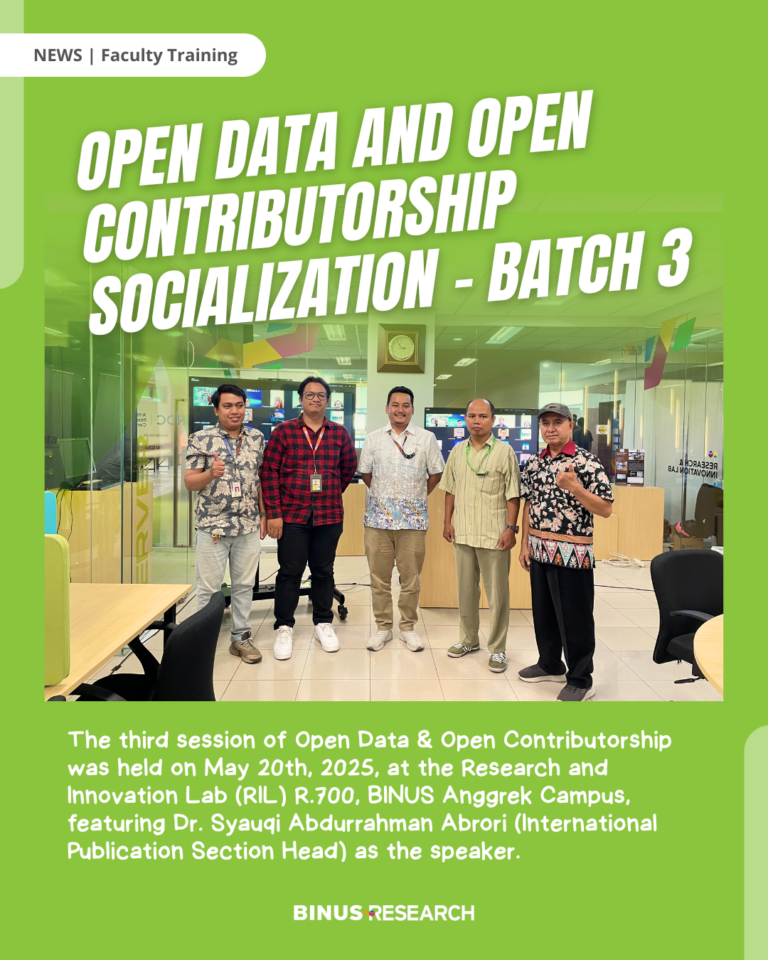 Sosialisasi Open Data & Open Contributorship #3 telah dilaksanakan pada Selasa, 20 Mei 2025, di Research and Innovation Lab (RIL) R.700, BINUS Kampus Anggrek. Kegiatan ini menghadirkan Dr. Syauqi Abdurrahman Abrori (BINUS RTT International Publication Section Head) sebagai pembicara dan bertujuan meningkatkan pemahaman dosen dan peneliti mengenai pentingnya keterbukaan data dalam penelitian. Melalui sesi ini, peserta diajak memahami bagaimana praktik open data dan open contributorship dapat meningkatkan transparansi, kolaborasi, serta integritas riset di lingkungan akademik.