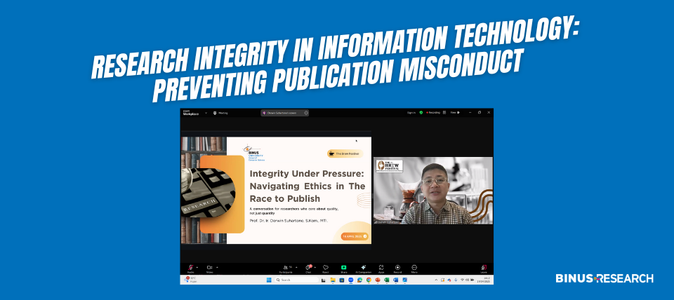 Webinar “Menjadi Peneliti Berintegritas: Mencegah dan Memitigasi Pelanggaran Etika Publikasi (IT)” yang diselenggarakan pada Senin, 14 April 2025 melalui Zoom menghadirkan Prof. Dr. Ir. Derwin Suhartono, S.Kom., MTI (Dekan School of Computer Science BINUS University) sebagai pembicara. Acara ini bertujuan memberikan pemahaman mendalam mengenai prinsip etika publikasi, mengenali berbagai bentuk pelanggaran, serta membekali peserta dengan strategi pencegahan dan mitigasi untuk menjaga integritas penelitian.