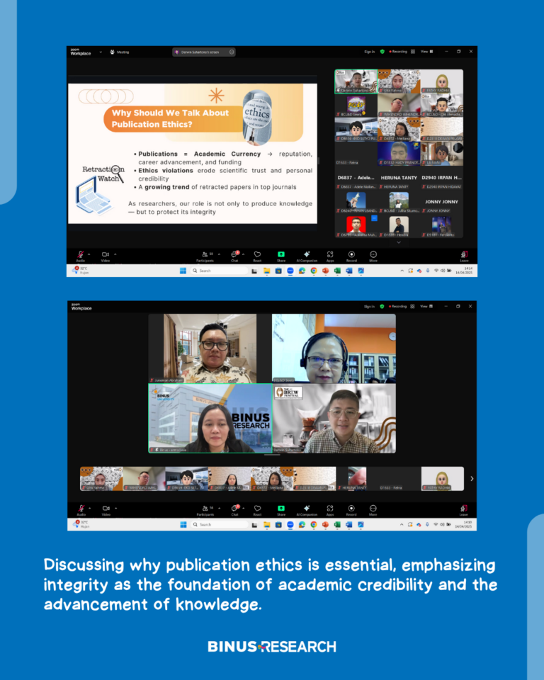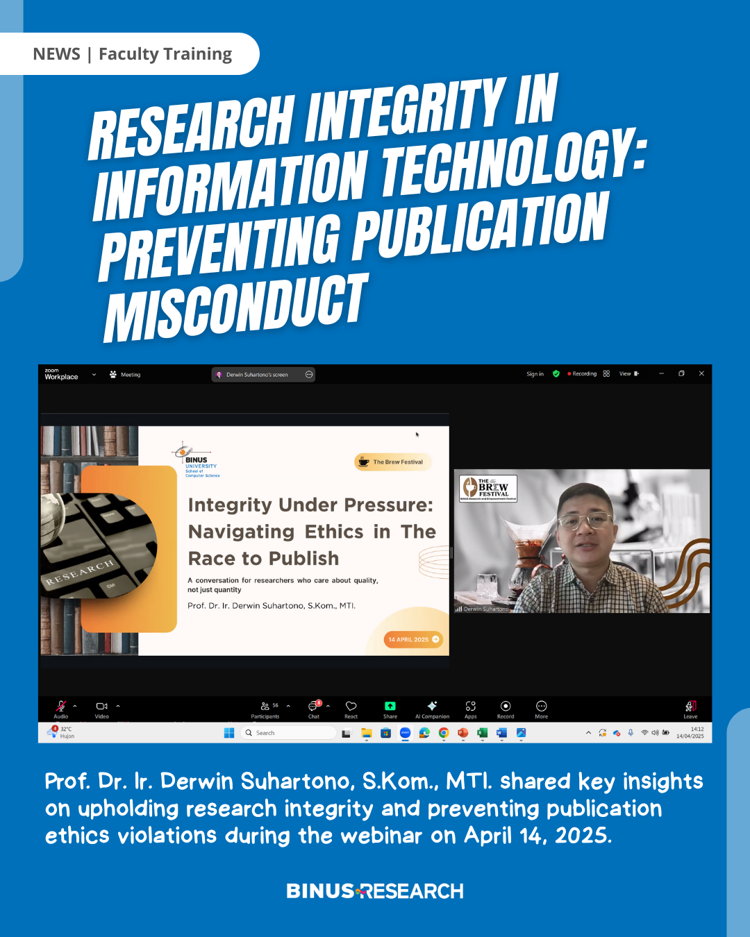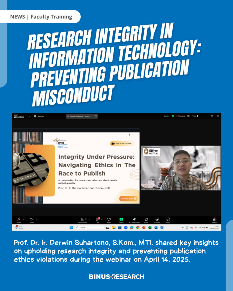Webinar “Menjadi Peneliti Berintegritas: Mencegah dan Memitigasi Pelanggaran Etika Publikasi (IT)” yang diselenggarakan pada Senin, 14 April 2025 melalui Zoom menghadirkan Prof. Dr. Ir. Derwin Suhartono, S.Kom., MTI (Dekan School of Computer Science BINUS University) sebagai pembicara. Acara ini bertujuan memberikan pemahaman mendalam mengenai prinsip etika publikasi, mengenali berbagai bentuk pelanggaran, serta membekali peserta dengan strategi pencegahan dan mitigasi untuk menjaga integritas penelitian.