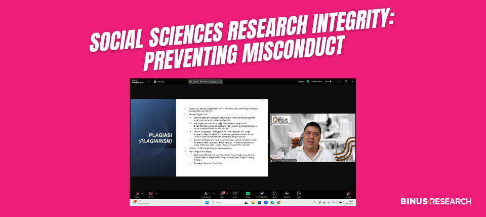 The webinar “Research Integrity in Social Sciences: Preventing Publication Misconduct” was successfully held on Wednesday, April 30th, 2025 featuring Prof. Dr. Arta Moro Sundjaja, S.Kom., S.E., M.M., CDMS (Research & Community Engagement Manager and Doctor of Research in Management BINUS University). The session brought together researchers, students, and academics to discuss the core principles of publication ethics, the types of misconduct that may arise, and effective approaches to prevent and mitigate these challenges.