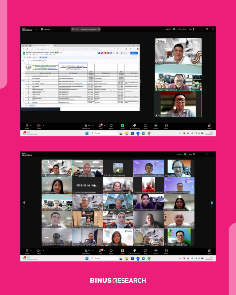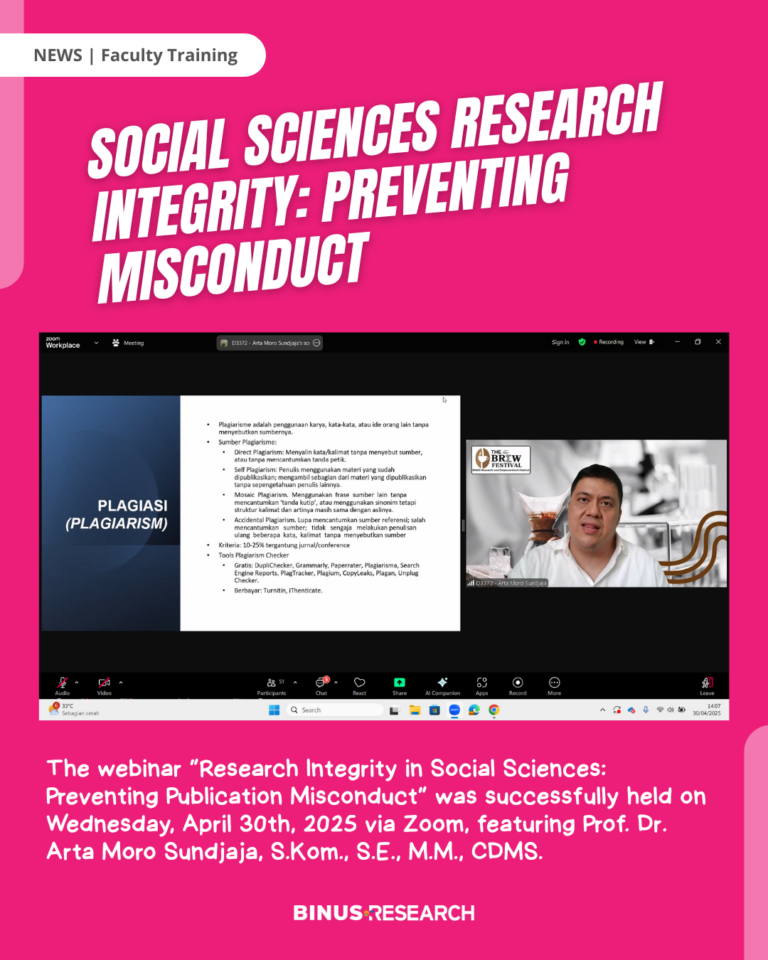 The webinar “Research Integrity in Social Sciences: Preventing Publication Misconduct” was successfully held on Wednesday, April 30th, 2025 featuring Prof. Dr. Arta Moro Sundjaja, S.Kom., S.E., M.M., CDMS (Research & Community Engagement Manager and Doctor of Research in Management BINUS University). The session brought together researchers, students, and academics to discuss the core principles of publication ethics, the types of misconduct that may arise, and effective approaches to prevent and mitigate these challenges.