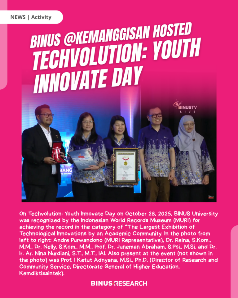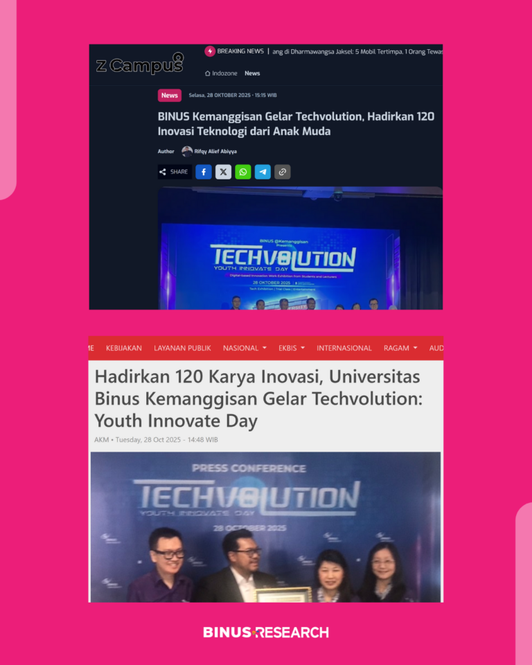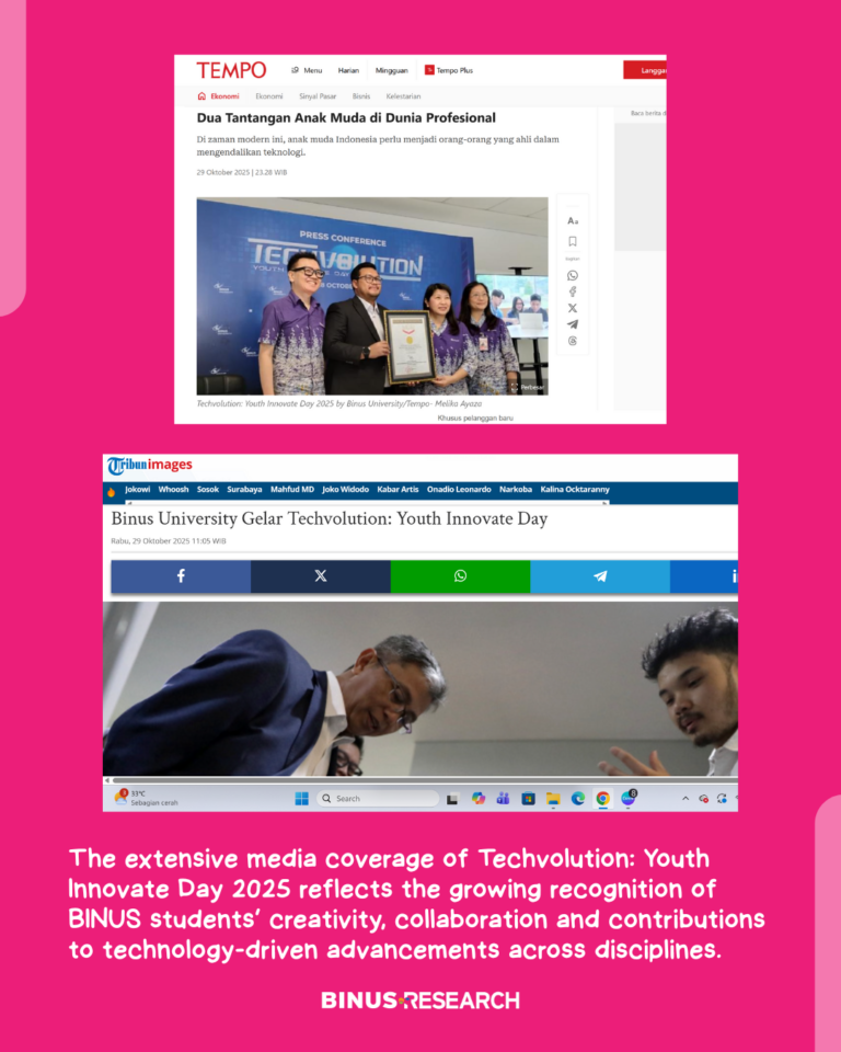 BINUS @Kemanggisan sukses menggelar Techvolution: Youth Innovate Day bertepatan dengan Hari Sumpah Pemuda 28 Oktober 2025, menghadirkan lebih dari 120 karya inovasi teknologi hasil kolaborasi mahasiswa lintas program studi. Pameran ini menampilkan solusi kreatif untuk menjawab tantangan masa kini melalui teknologi, mulai dari kecerdasan buatan, EdTech, extended reality, hingga smart city dan inovasi berkelanjutan. Melalui kegiatan ini, BINUS University menegaskan perannya sebagai pusat pengembangan Digital Technology di Indonesia, sekaligus mendorong lahirnya talenta muda yang mampu menciptakan teknologi yang humanis, berdampak, dan berkontribusi bagi kemajuan bangsa.
