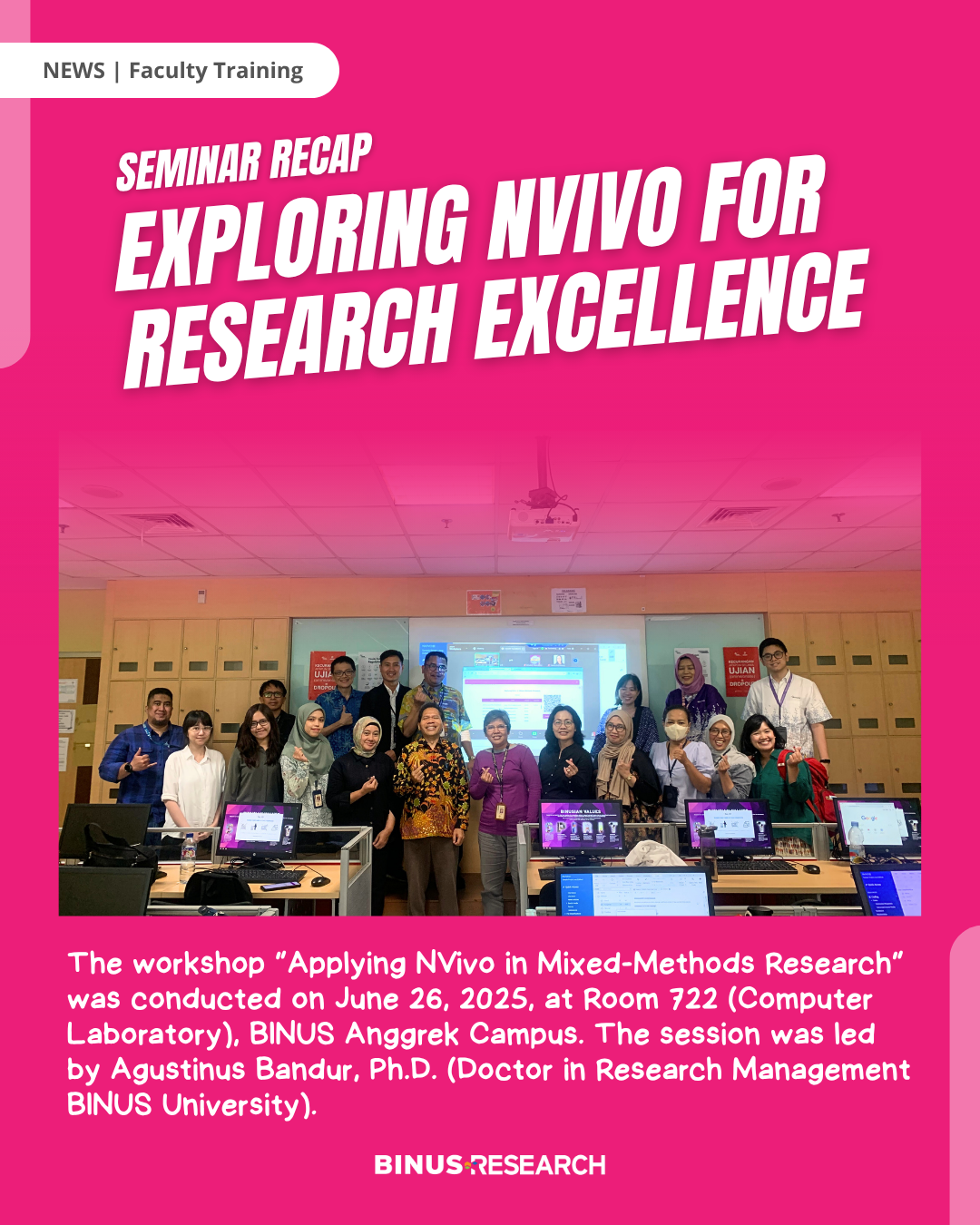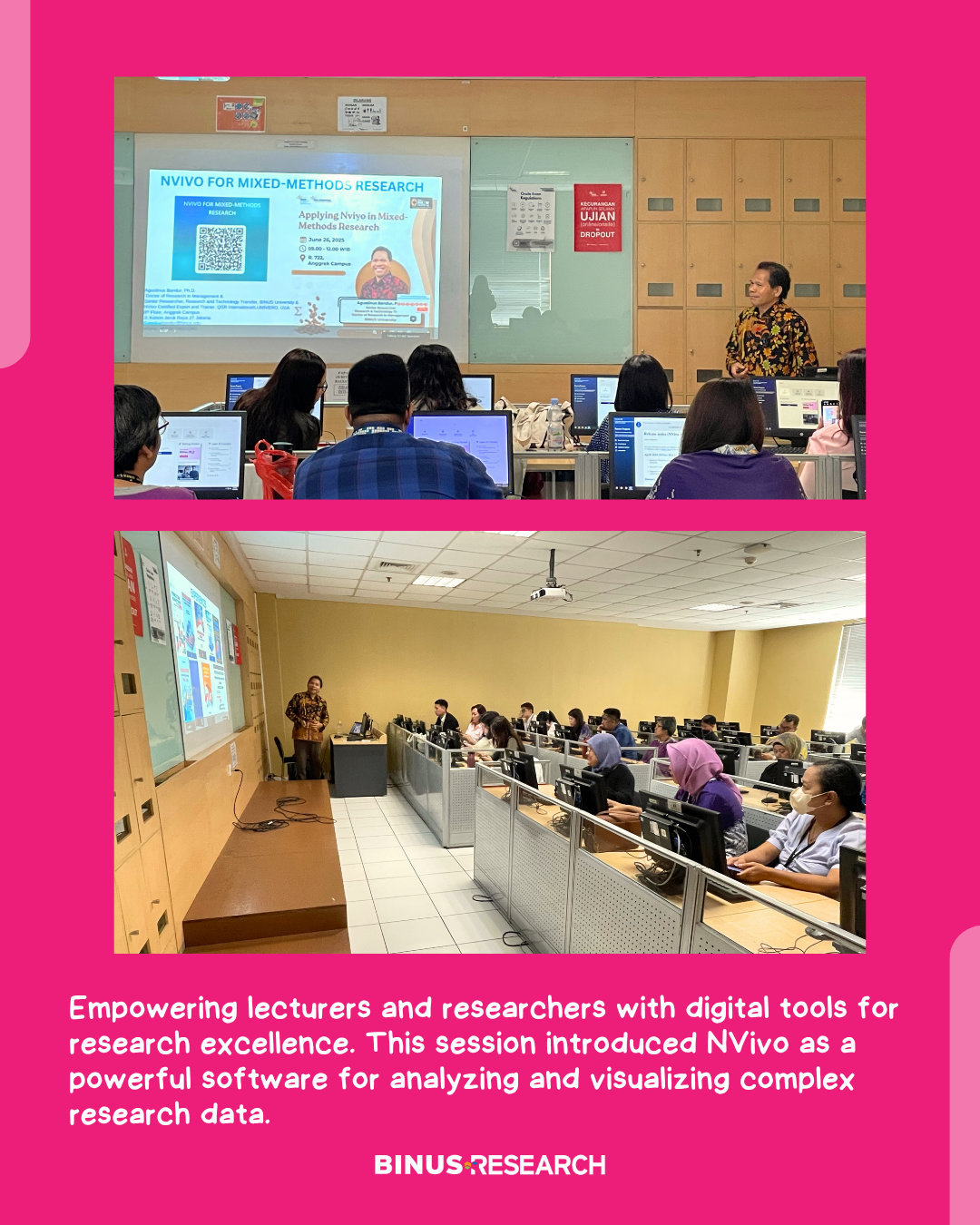 The workshop “Applying NVivo in Mixed-Methods Research” was conducted on June 26, 2025, at Room 722 (Computer Laboratory), BINUS Anggrek Campus. The session was led by Agustinus Bandur, Ph.D. (Doctor in Research Management BINUS University) who provided an in-depth explanation of how the NVivo software can be effectively applied in mixed-methods research to support the writing of high-quality scientific articles.