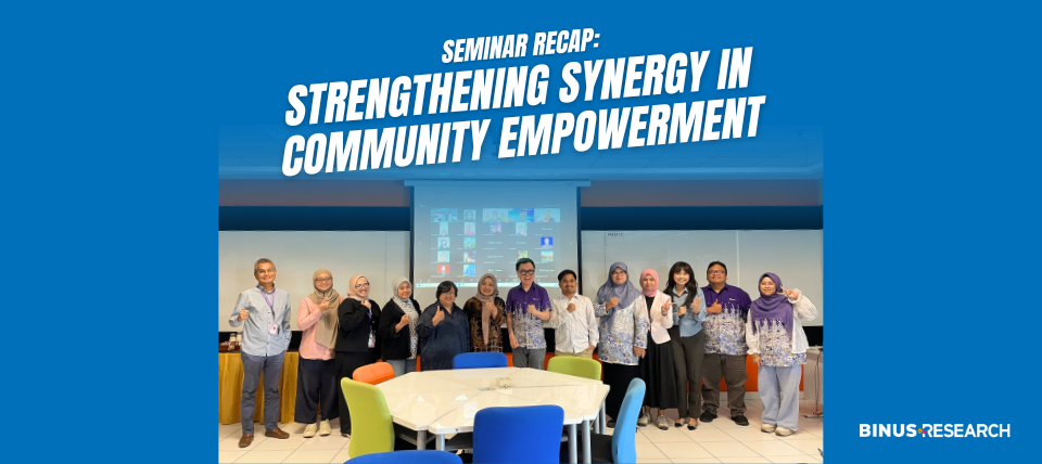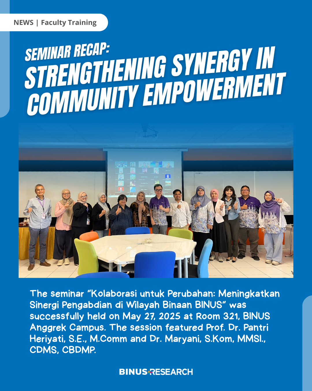 Kegiatan “Kolaborasi untuk Perubahan: Meningkatkan Sinergi Pengabdian di Wilayah Binaan BINUS” sukses dilaksanakan pada 27 Mei 2025 di R.321 BINUS Kampus Anggrek. Sesi ini menghadirkan Prof. Dr. Pantri Heriyati, S.E., M.Comm (Guru Besar Tetap dalam bidang Entrepreneurship dan Head of Social & Business Empowerment BINUS University) dan Dr. Maryani, S.Kom, MMSI., CDMS, CBDMP (Empowering Section Head dan Information System Faculty Member BINUS University), yang memaparkan strategi dalam mengidentifikasi kebutuhan serta potensi wilayah binaan, sekaligus merancang program pengabdian masyarakat yang mampu meningkatkan kesejahteraan masyarakat. Para peserta memperoleh wawasan praktis mengenai kolaborasi lintas disiplin dalam kegiatan pemberdayaan yang berkelanjutan.