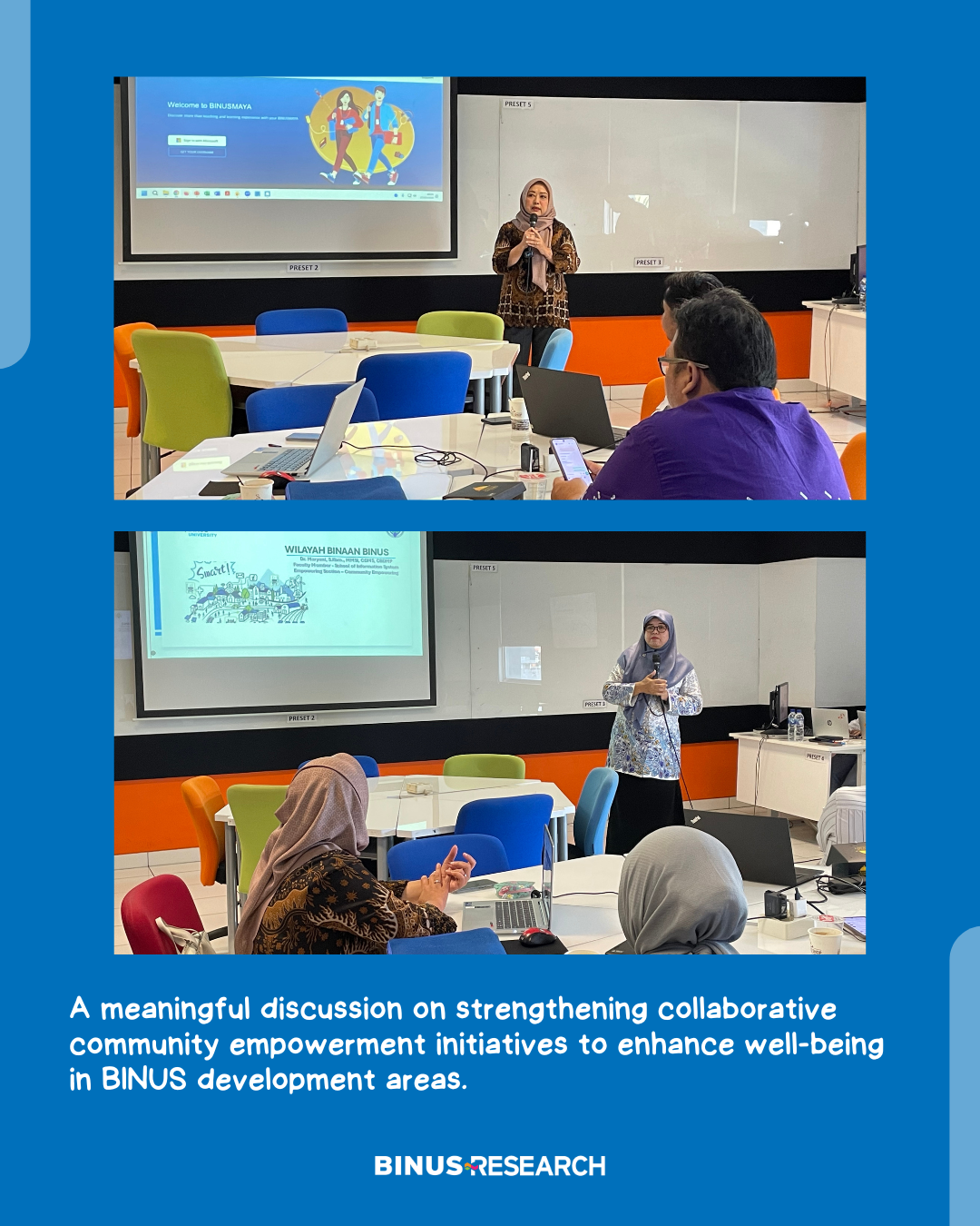Participants gained practical guidance on formulating community service initiatives aimed at enhancing well-being within BINUS development areas. The discussion highlighted collaborative approaches that integrate academic expertise with social responsibility, enabling faculty members and students to contribute more effectively to long-term community development.