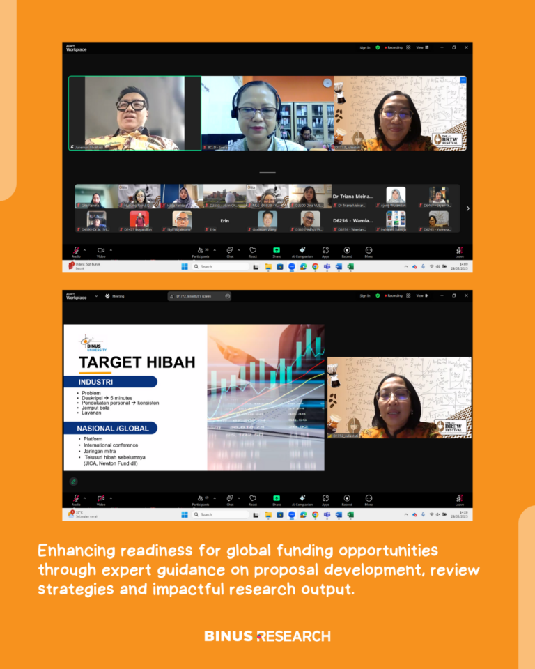 Webinar “Kolaborasi Riset: Mengenali Peluang Hibah dari Lembaga Pendanaan Internasional” sukses dilaksanakan pada 28 Mei 2025 melalui Zoom Meeting. Kegiatan ini menghadirkan Dr. Ir. Juliastuti, M.T. (Research Coordinator dan Civil Engineering Faculty Member BINUS University) dan Nunung Nurul Qomariyah, S.Kom., M.T.I., Ph.D (Subject Content Coordinator dan Computer Science Faculty Member BINUS University), yang membagikan wawasan strategis mengenai penyusunan proposal hibah penelitian, tahapan penting dalam memperoleh pendanaan, serta tips dalam mencari dan memanfaatkan berbagai skema hibah nasional maupun internasional. Para peserta memperoleh pemahaman lebih mendalam terkait strategi output riset dan karakteristik kompetisi hibah untuk meningkatkan peluang keberhasilan pendanaan penelitian.