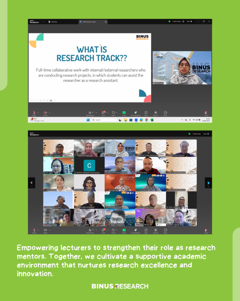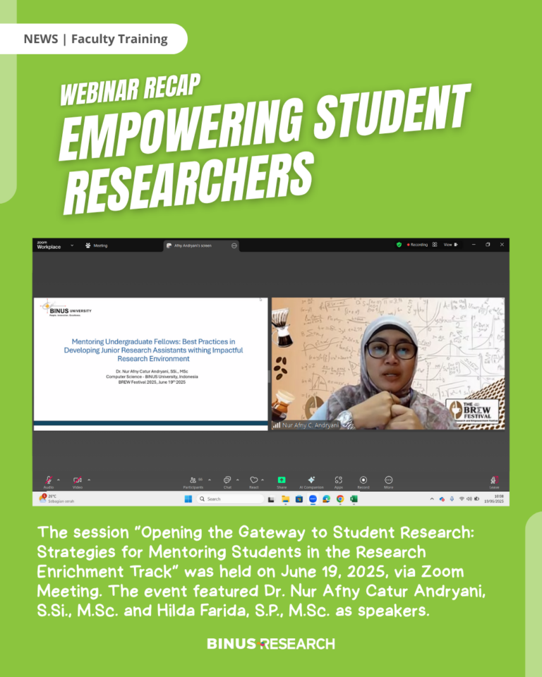 Kegiatan “Buka Gerbang Riset untuk Mahasiswa: Strategi Membimbing Mahasiswa di Enrichment Track Riset” diselenggarakan pada Kamis, 19 Juni 2025 secara daring melalui Zoom Meeting. Kegiatan ini menghadirkan Dr. Nur Afny Catur Andryani, S.Si., M.Sc. (Doktor Computer Science dan Peneliti di Bidang Teknologi Kesehatan BINUS University) dan Hilda Farida, S.P., M.Sc. (Research Enrichment Section Head BINUS University) sebagai narasumber, yang berbagi strategi membimbing mahasiswa dalam memilih jalur riset mereka. Melalui sesi ini, para peserta mempelajari bagaimana cara merancang strategi pendampingan yang efektif, meningkatkan kompetensi riset mahasiswa, serta menghasilkan luaran penelitian yang lebih berkualitas untuk mendukung pengembangan kapasitas riset di lingkungan akademik.