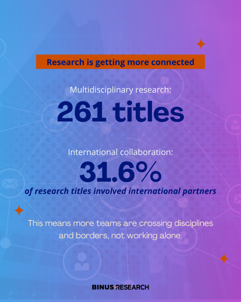 This year, BINUS supported research at scale, with Rp30.46B in research grants across 500 titles, involving 429 faculty members. We are also happy to see research becoming more connected, with 261 multidisciplinary titles and 31.6% of research titles involving international partners.
