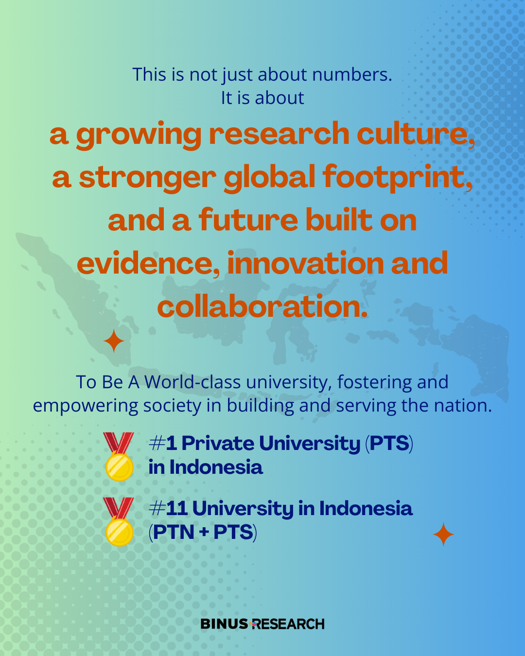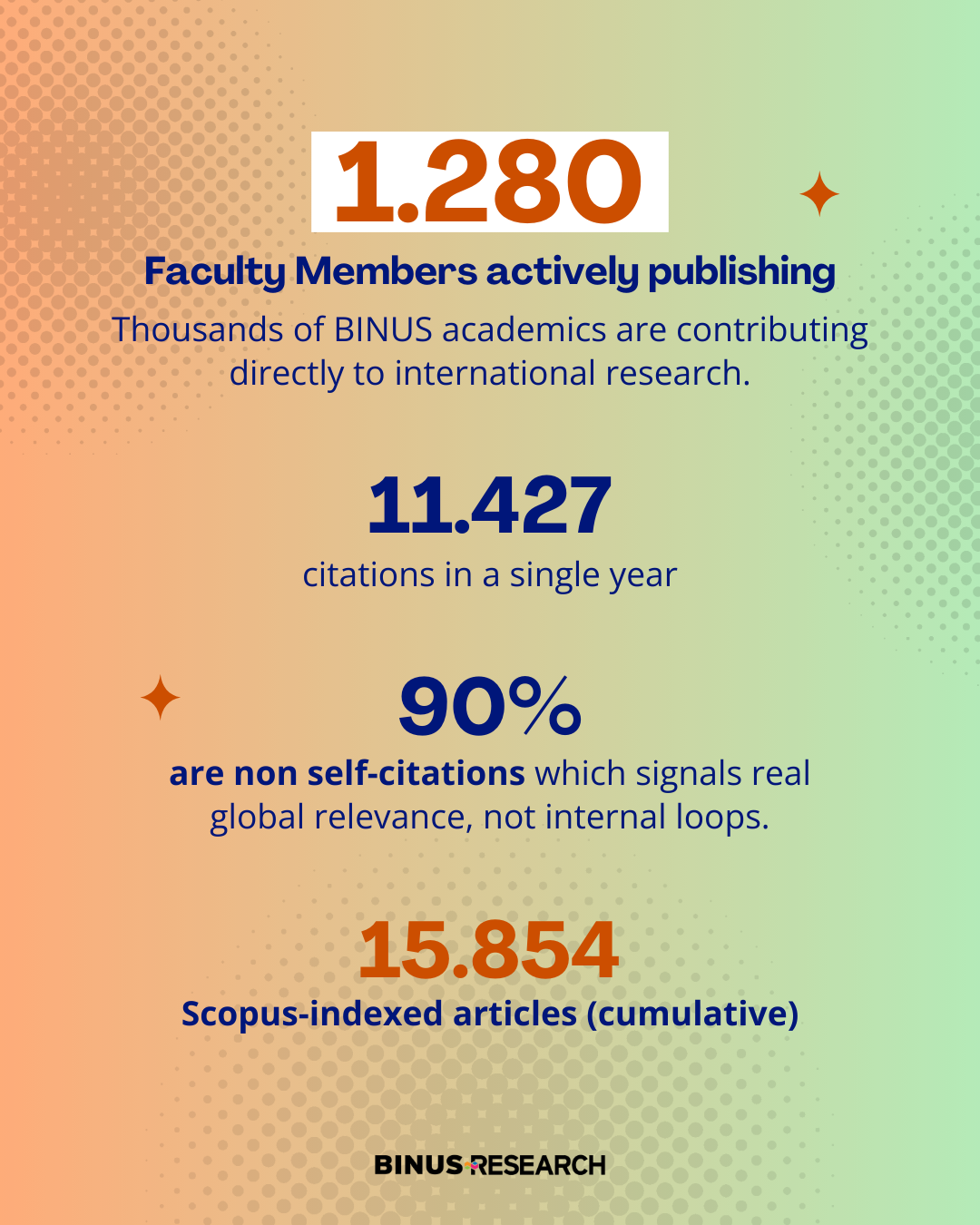 The impact is also speaking globally: 11,427 citations in a single year, with 90% coming from non self-citations, showing that BINUS research is being recognized and used beyond our own community. With 15,854 Scopus-indexed articles cumulatively, BINUS stands as #1 private university in Indonesia and #11 nationally (public + private).