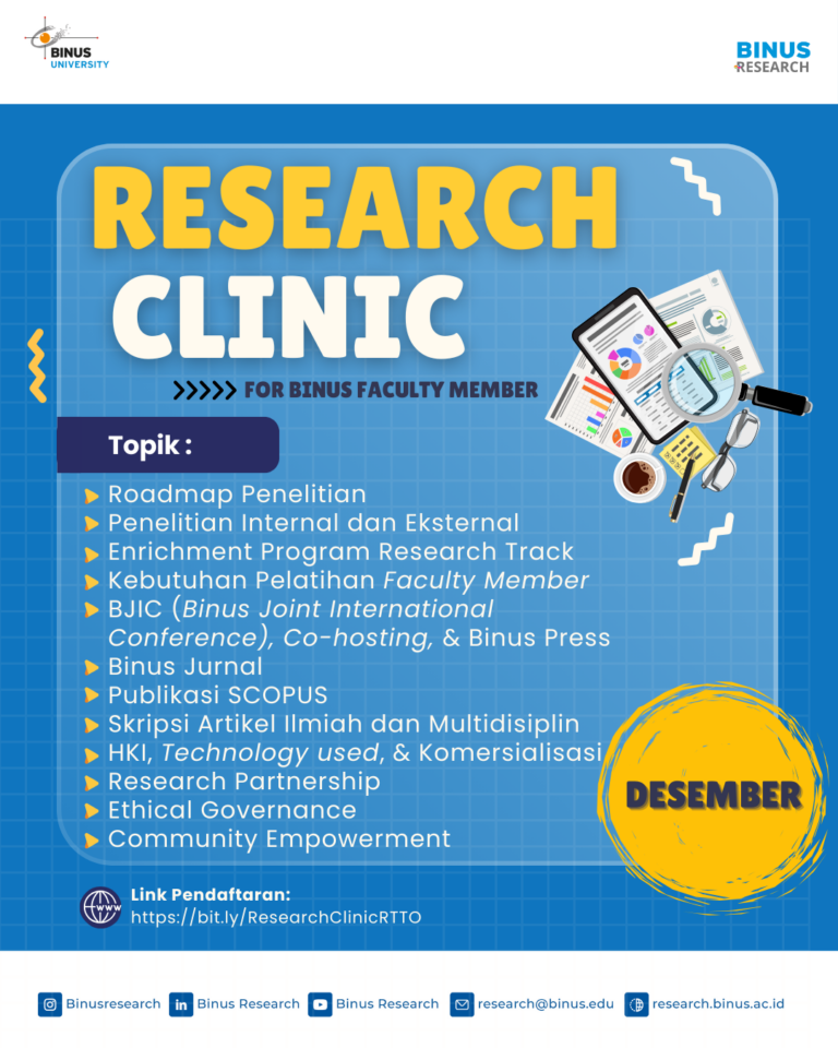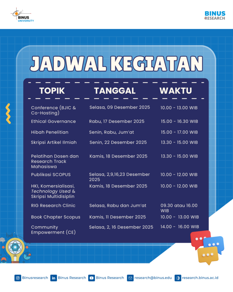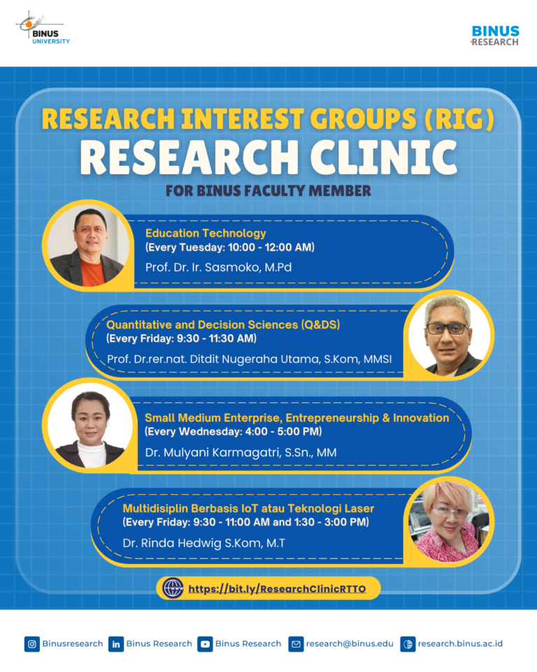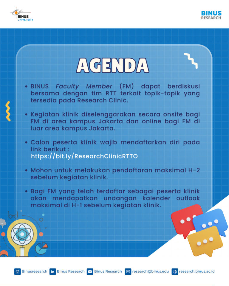 In this event, BINUS Faculty Members can ask questions and discuss with the RTT team several research topics on the following schedules :