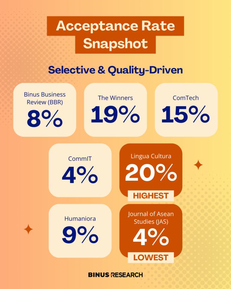 Binus Journal menorehkan berbagai capaian penting sepanjang 2025—mulai dari penguatan kolaborasi, peningkatan visibilitas global, hingga komitmen pada praktik open science. Setiap langkah mencerminkan upaya menjaga kualitas, integritas, dan dampak riset yang berkelanjutan. Mari terus bergerak bersama membangun ekosistem publikasi ilmiah yang kredibel dan berdampak.