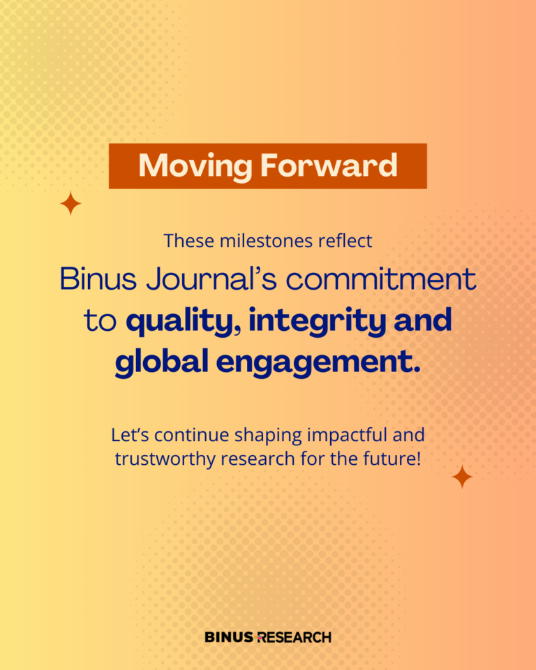 Binus Journal marked significant milestones in 2025, strengthening collaboration, global visibility, and commitment to open science. These achievements reflect a continuous dedication to quality, integrity, and meaningful research impact. Moving forward, we remain focused on advancing trustworthy and impactful scholarly publishing.