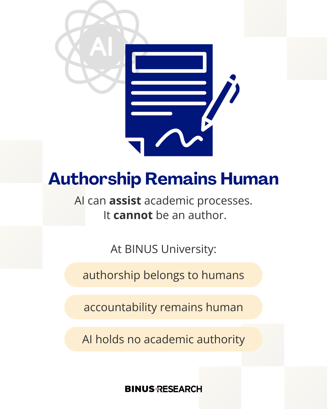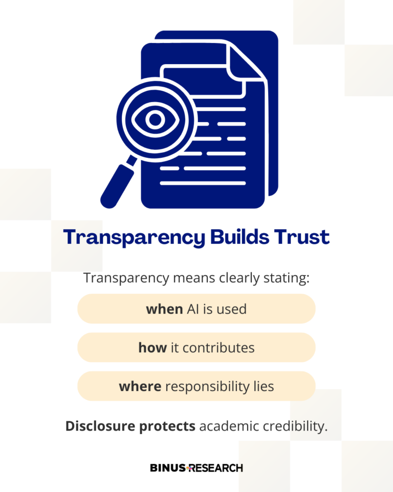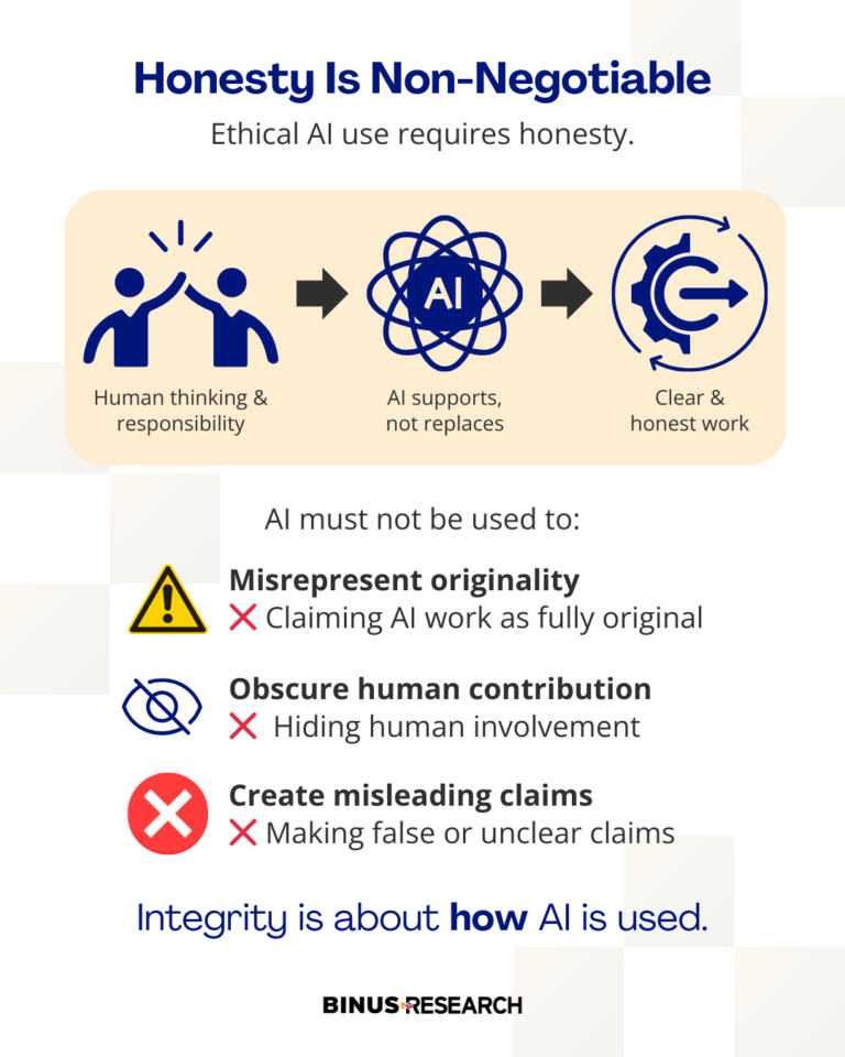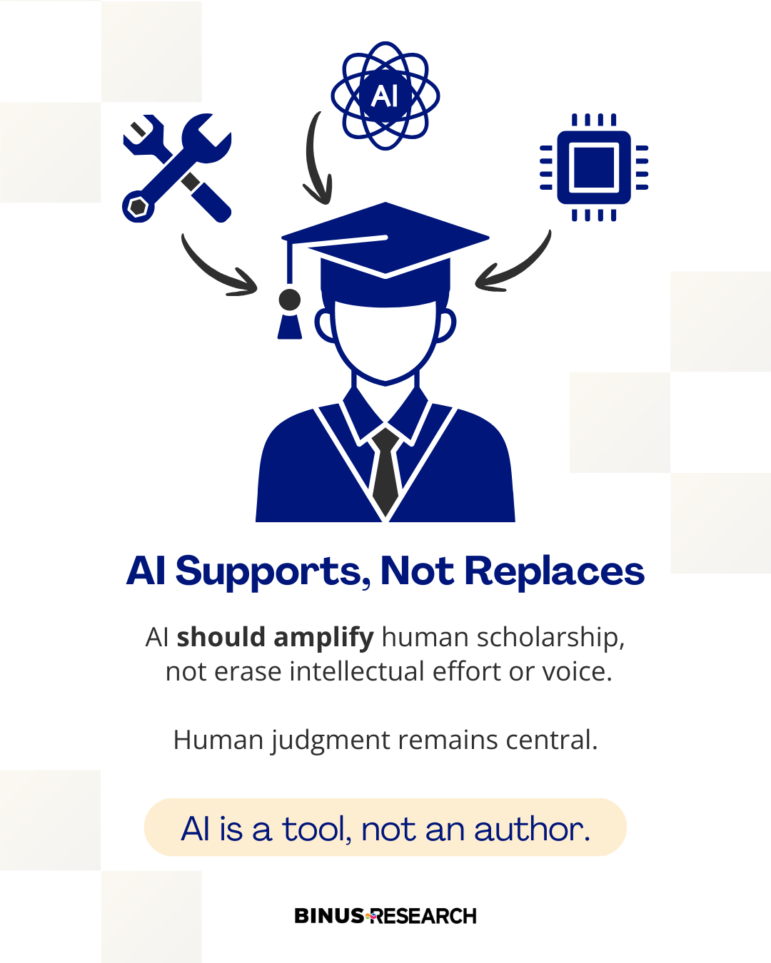 Penggunaan AI yang etis menuntut keterbukaan atas peran AI, atribusi yang jelas terhadap setiap kontribusi yang bermakna, serta penghormatan terhadap suara dan upaya ilmiah. AI tidak boleh menutupi, menggantikan, atau mengurangi kontribusi manusia.