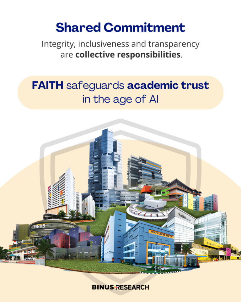 Melalui FAITH, BINUS University mendorong penggunaan AI yang bertanggung jawab untuk menjaga kejujuran, menghargai kontribusi, dan memelihara kepercayaan terhadap pengetahuan akademik.