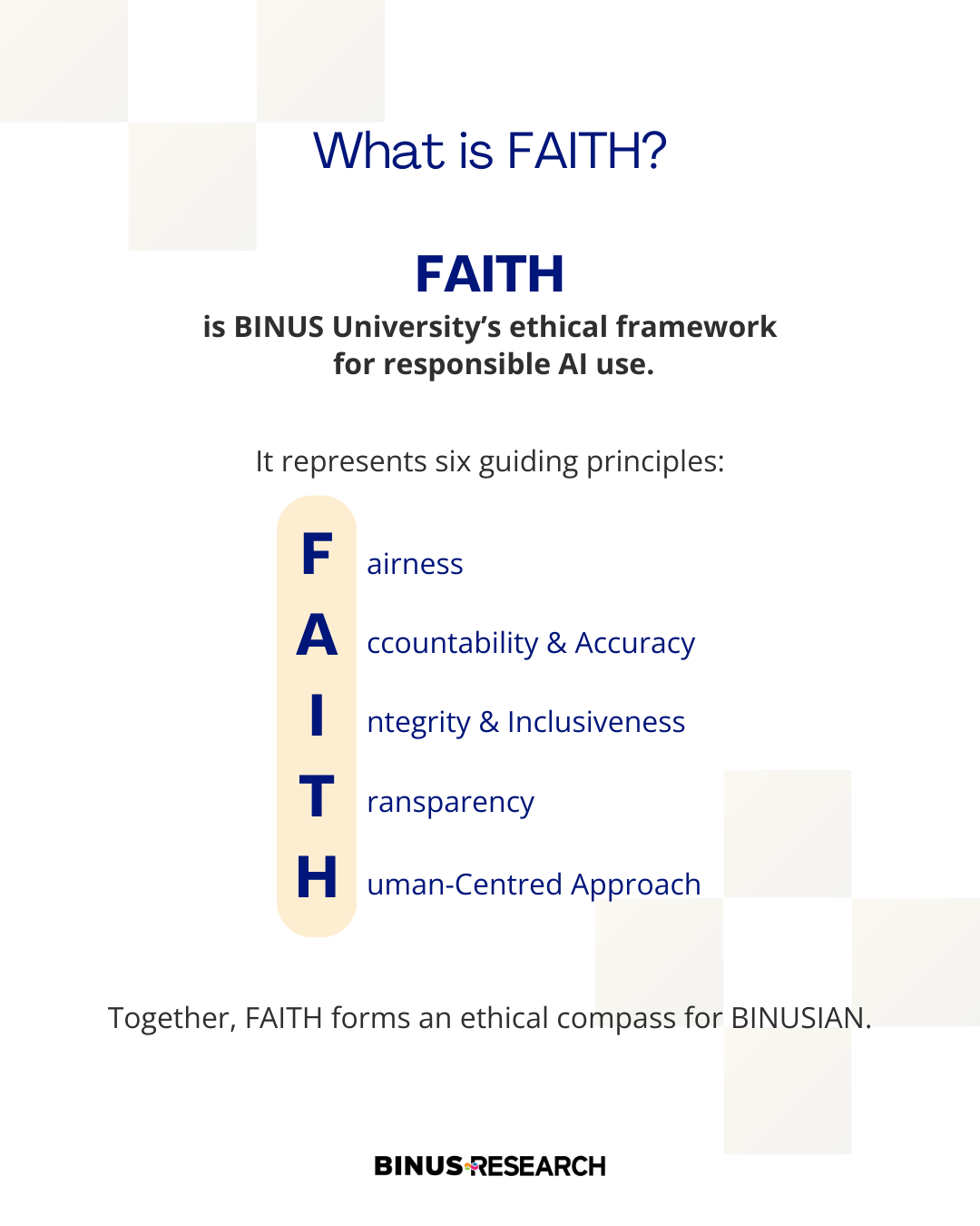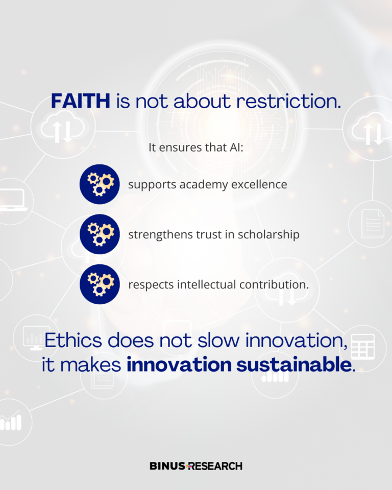 At BINUS University, the use of AI by Faculty Members is guided by FAITH — a set of ethical principles that shape professional judgment, responsibility, and academic integrity.