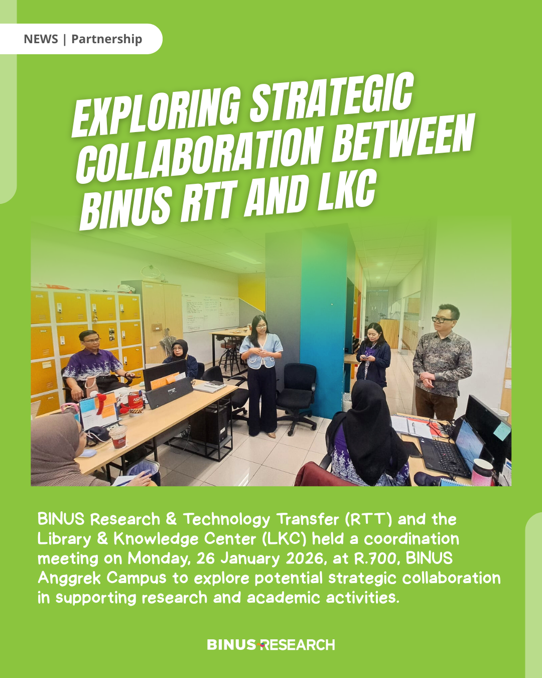 BINUS Research & Technology Transfer (RTT) and the Library & Knowledge Center (LKC) held a coordination meeting on Monday, 26 January 2026, at BINUS Anggrek Campus to explore potential strategic collaboration in supporting research and academic activities. The meeting was attended by all RTT staff, including Prof. Dr. Juneman Abraham, S.Psi., M.Sc. (Vice Rector – Research & Technology Transfer), along with LKC representatives Hanny Juwitasary, S.E., S.Kom., M.MSI., CBDMP (Library and Knowledge Center Manager), Lies Dwi Ningsih, S.S.I (Collection Development Section Head), and Rony Baskoro Lukito, S.Kom., M.Kom (Electronic Services & System Section Head). The discussion highlighted opportunities to strengthen information access, research services, and publication support across BINUS University.