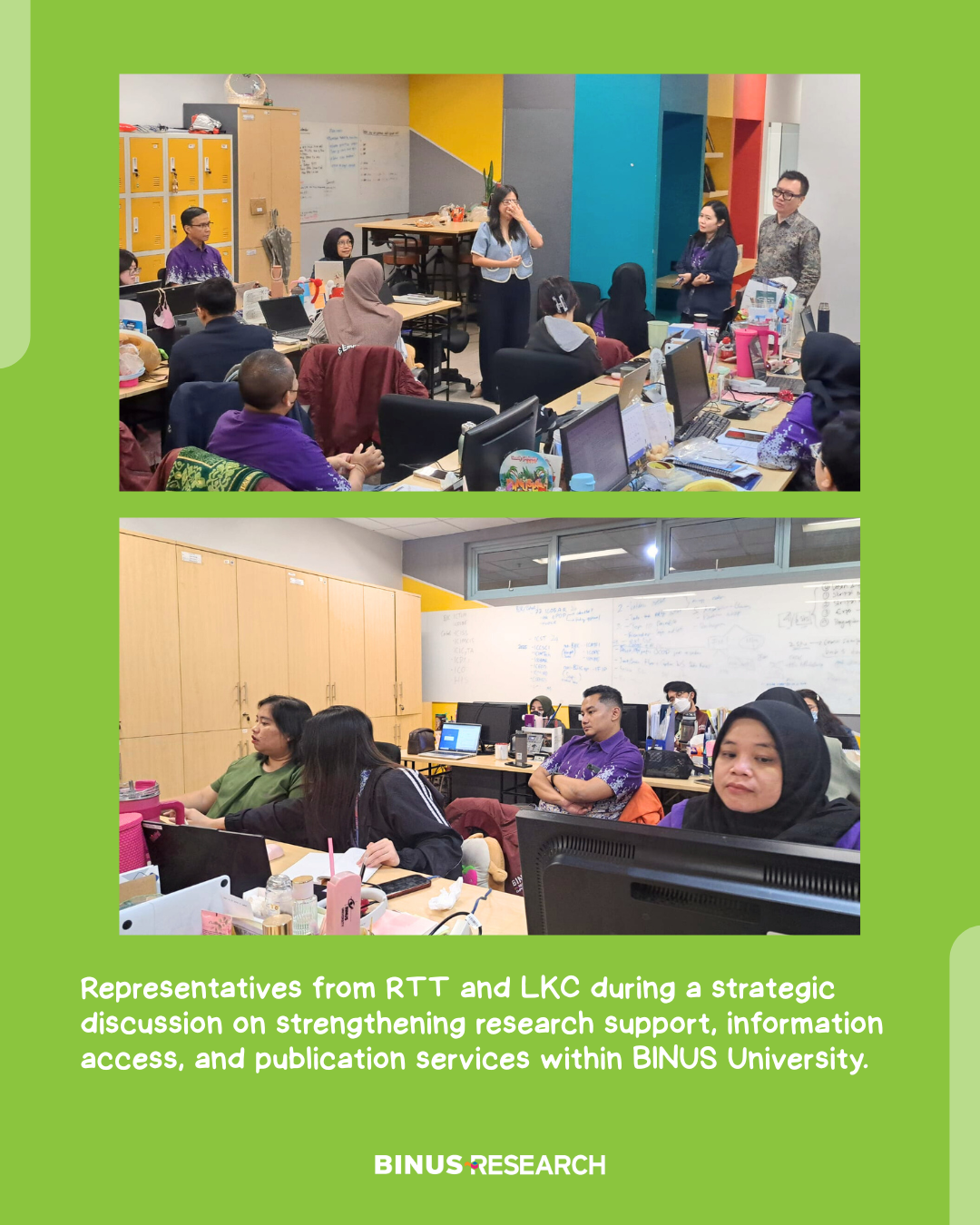 BINUS Research & Technology Transfer (RTT) bersama Library & Knowledge Center (LKC) mengadakan pertemuan koordinasi pada Senin, 26 Januari 2026, di BINUS Anggrek Campus untuk membahas potensi kerja sama strategis dalam mendukung kegiatan riset dan akademik. Pertemuan ini dihadiri oleh seluruh karyawan RTT, termasuk Prof. Dr. Juneman Abraham, S.Psi., M.Sc. (Vice Rector – Research & Technology Transfer), serta perwakilan LKC yang terdiri dari Hanny Juwitasary, S.E., S.Kom., M.MSI., CBDMP (Library and Knowledge Center Manager), Lies Dwi Ningsih, S.S.I (Collection Development Section Head), dan Rony Baskoro Lukito, S.Kom., M.Kom (Electronic Services & System Section Head). Diskusi difokuskan pada peluang kolaborasi untuk memperkuat akses informasi, layanan riset, dan dukungan publikasi ilmiah di lingkungan BINUS University.