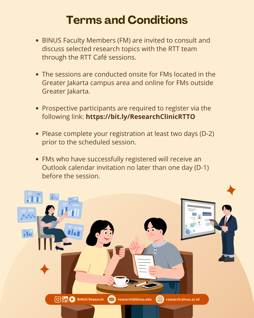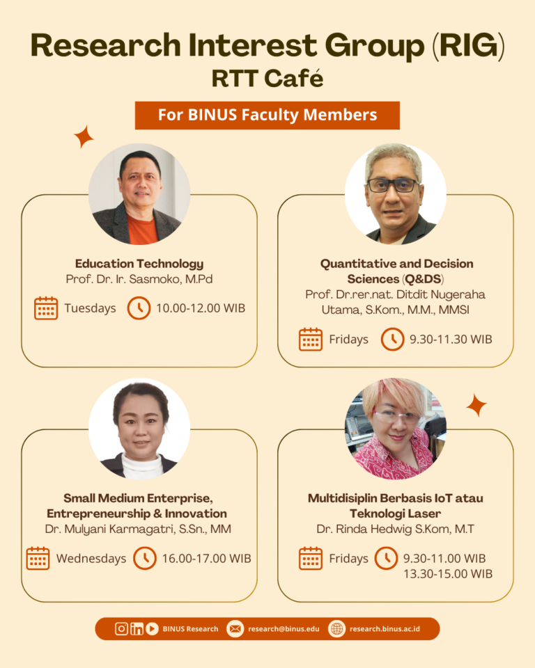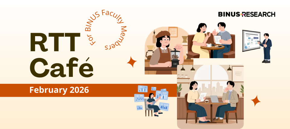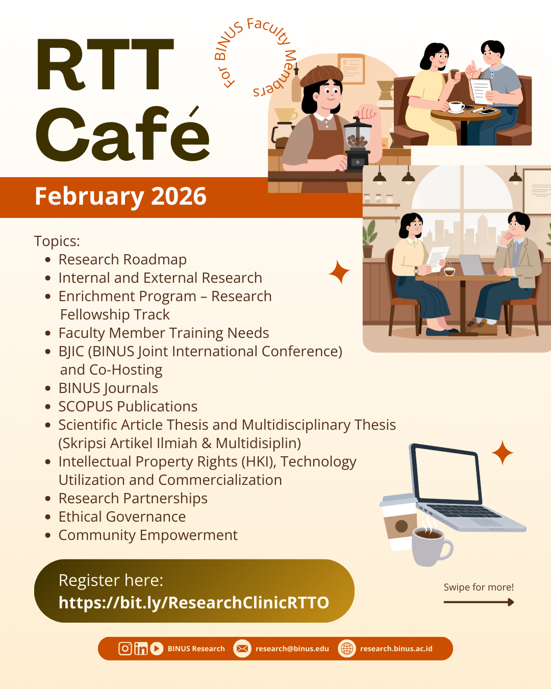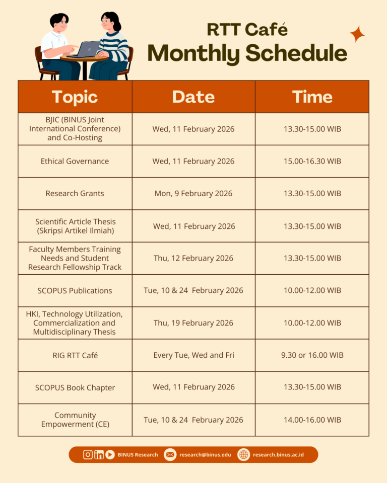 RTT Research Clinic has officially transformed into RTT Café, a more collaborative and engaging space for BINUS Faculty Members to discuss research, grants, publications and innovation with the RTT team. Faculty Members are invited to consult and explore various research topics according to the schedule below.