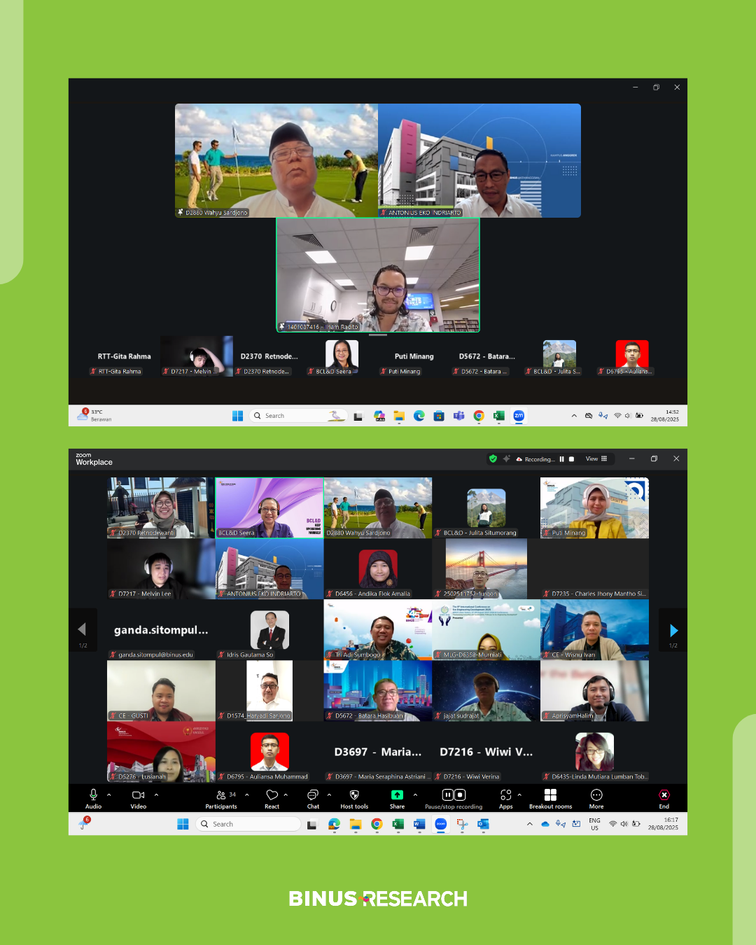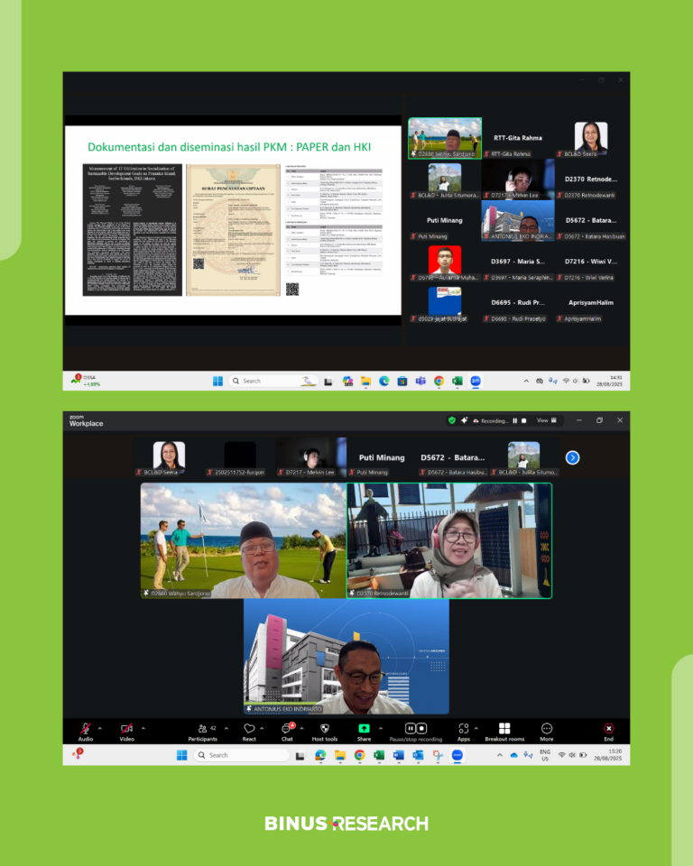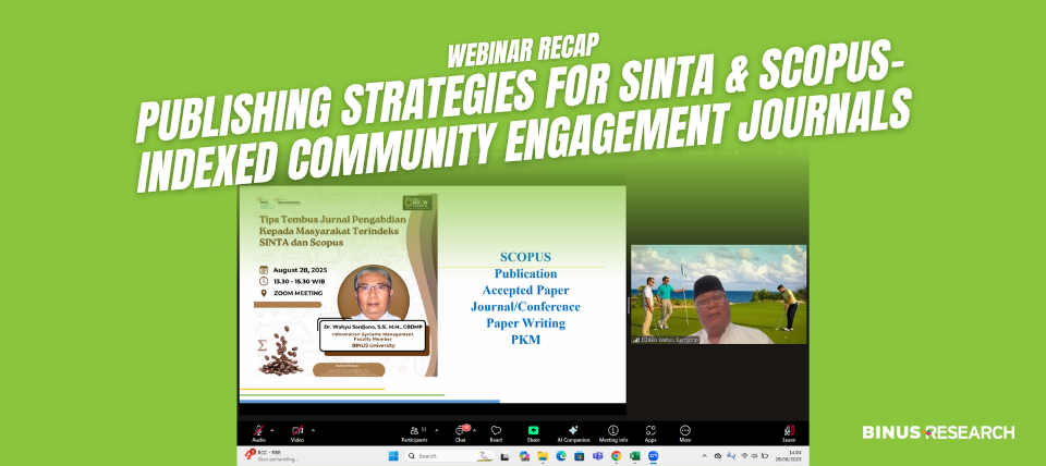BINUS RTT organized a session titled “Tips to Publish in SINTA and Scopus-Indexed Community Engagement Journals” on Thursday, 28 August 2025, conducted online via Zoom Meeting. The session featured Dr. Wahyu Sardjono, S.Si., M.M., CBDMP (Faculty Member at Master in Information Systems Management Study Program BINUS University) as the speaker and was designed to support lecturers and researchers in understanding the key characteristics and standards of community engagement journals indexed in SINTA and Scopus.