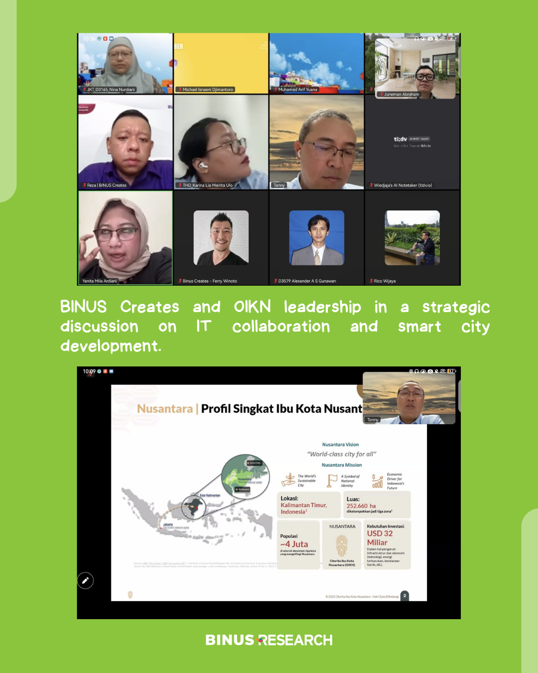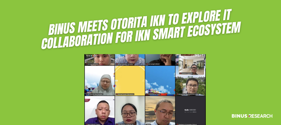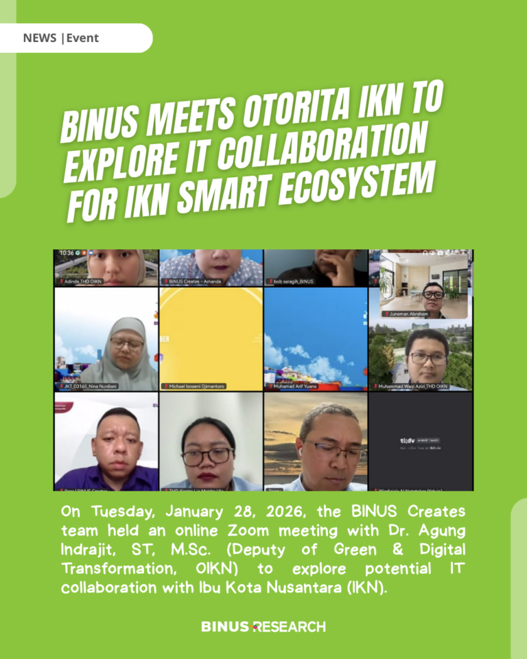 Pada Selasa, 28 Januari 2026, tim BINUS Creates mengadakan pertemuan daring via Zoom dengan Dr. Agung Indrajit, ST, M.Sc. (Deputi Transformasi Hijau & Digital OIKN) untuk membahas potensi kerja sama IT dengan Ibu Kota Nusantara (IKN). Pertemuan ini tindak lanjut diskusi sebelumnya antara Tim BINUS University yang terdiri atas Dr. Ar. Yanita Mila Ardiani, S.T., M.T., IAI (Head of Studio – Architecture), Dr. Ir. Nina Nurdiani, S.T., M.T. (Dekan F. Teknik); Prof. Dr. Juneman Abraham (Wakil Rektor Research & Technology Transfer); Dr. Ir. Alexander Agung Santoso Gunawan, S.Si., M.T., M.Sc., PCAP (RIG Leader – Geo-Eco AI); Ferry Winoto, S.Kom., MM, CCNP, MCP (CREATES Professional Services Director); Reza R. Suwandi (IT Product Manager); Dr. Ir. Juliastuti, M.T. (Research Coordinator) beserta tim. Diskusi fokus pada penjajakan kolaborasi IT, perencanaan ekosistem digital, dan pengembangan infrastruktur cerdas di IKN, Kaltim.