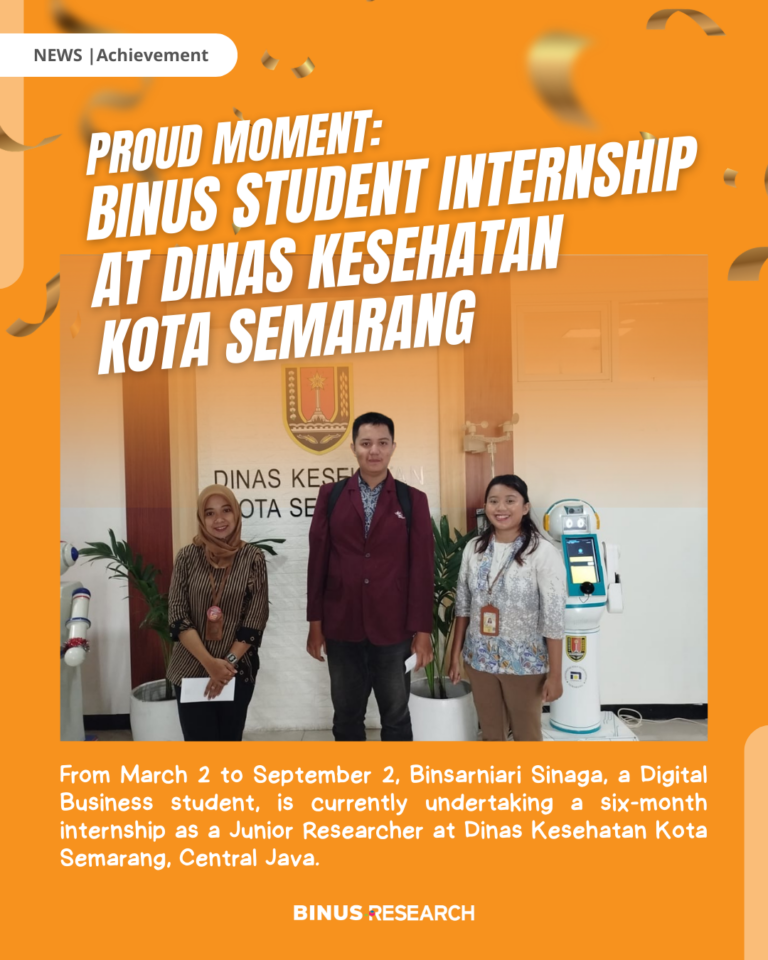 From March 2nd to September 2nd 2026, Binsarniari Sinaga, a Digital Business student BINUS @Semarang, is currently undertaking a six-month internship as a Junior Researcher at Dinas Kesehatan Kota Semarang, Central Java. The internship is part of his academic competency development through hands-on experience in the public sector. In this role, he is involved in research activities and data analysis to support information needs and data-driven decision-making within the Health Office. This program represents the practical application of Digital Business knowledge in strengthening public health governance.