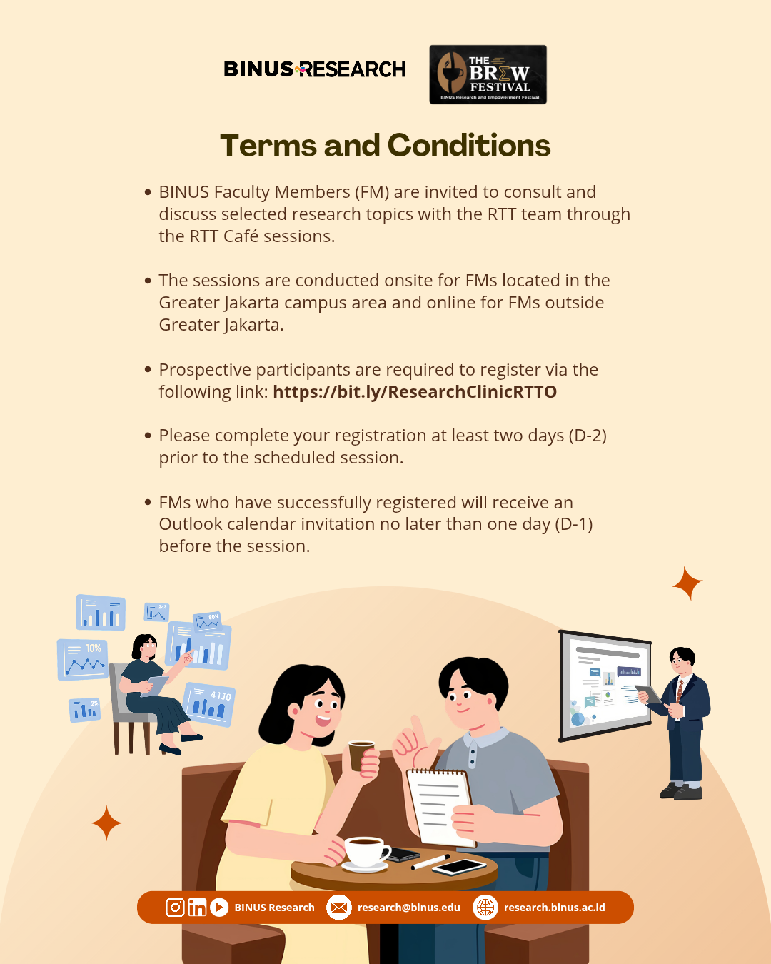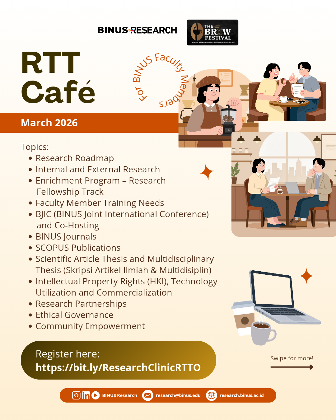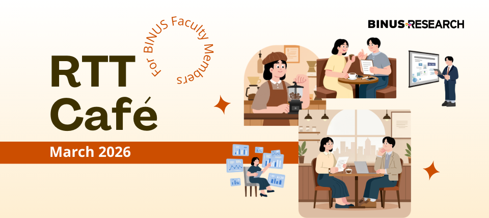 RTT Research Clinic has officially transformed into RTT Café, a more collaborative and engaging space for BINUS Faculty Members to discuss research, grants, publications and innovation with the RTT team. Faculty Members are invited to consult and explore various research topics according to the schedule below.