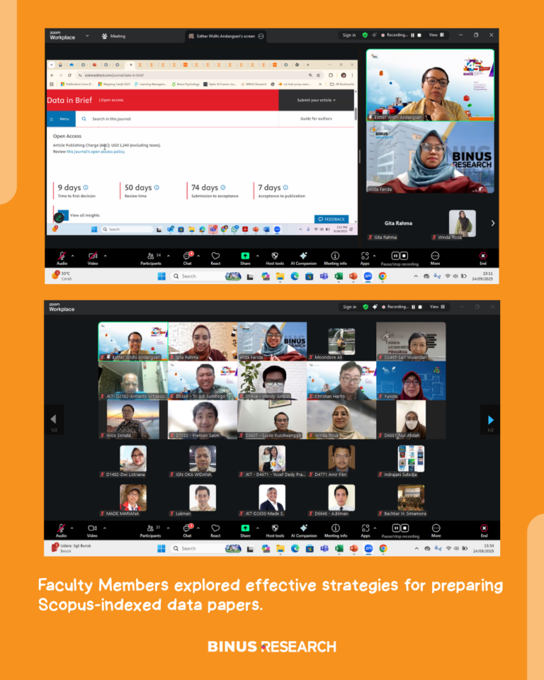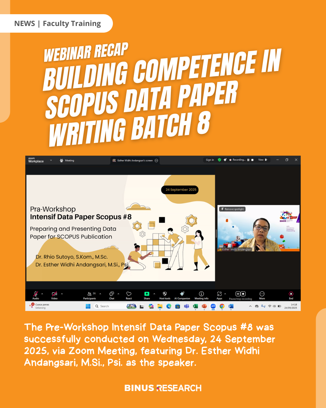 The Pre-Workshop Intensif Data Paper Scopus #8 was successfully conducted on Wednesday, 24 September 2025, via Zoom Meeting, featuring Dr. Esther Widhi Andangsari, M.Si., Psi. (Head of Psychology Study Program BINUS University) as the speaker. The session was designed for Faculty Members seeking to understand what a Scopus-indexed data paper is, why it is important and how to prepare and present research data in a concise, effective and ethical manner. Participants gained practical insights on structuring datasets and presenting them in alignment with international publication standards.