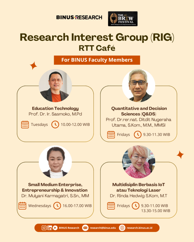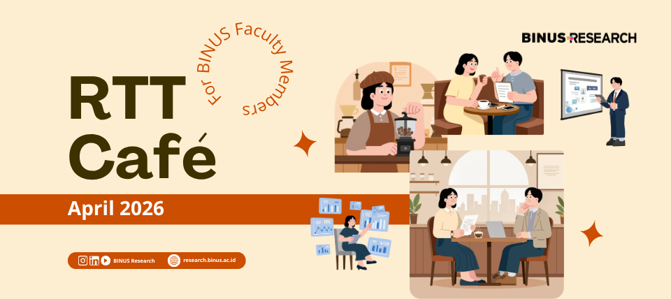 RTT is organizing a RTT Cafe in April 2026. RTT Café, a more collaborative and engaging space for BINUS Faculty Members to discuss research, grants, publications and innovation with the RTT team. Faculty Members are invited to consult and explore various research topics according to the schedule below.