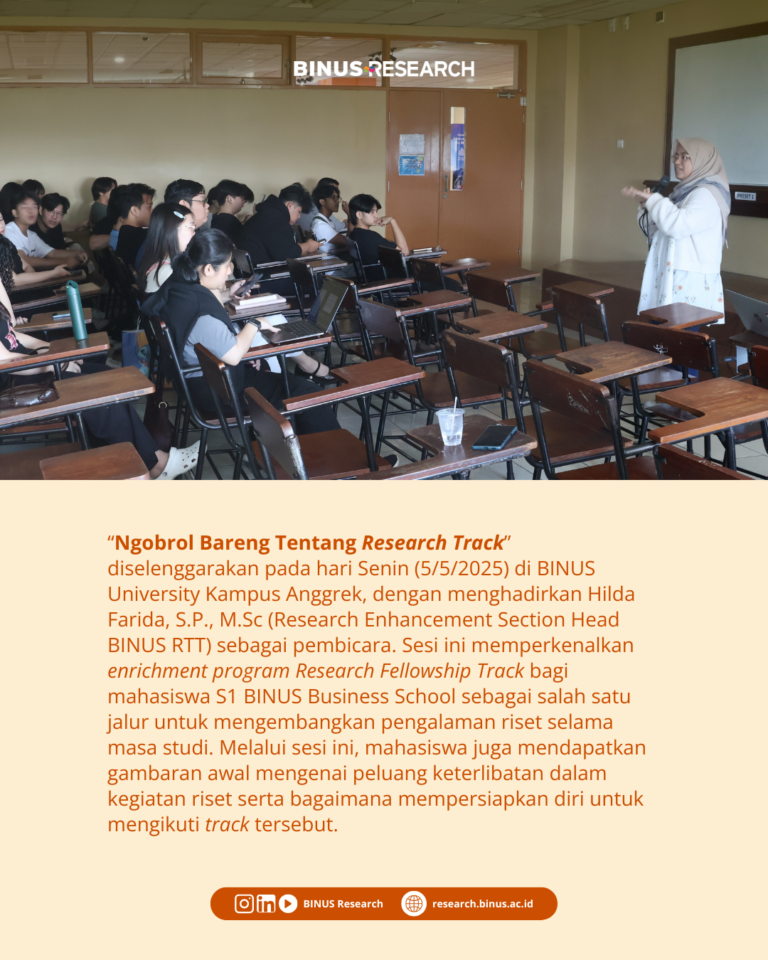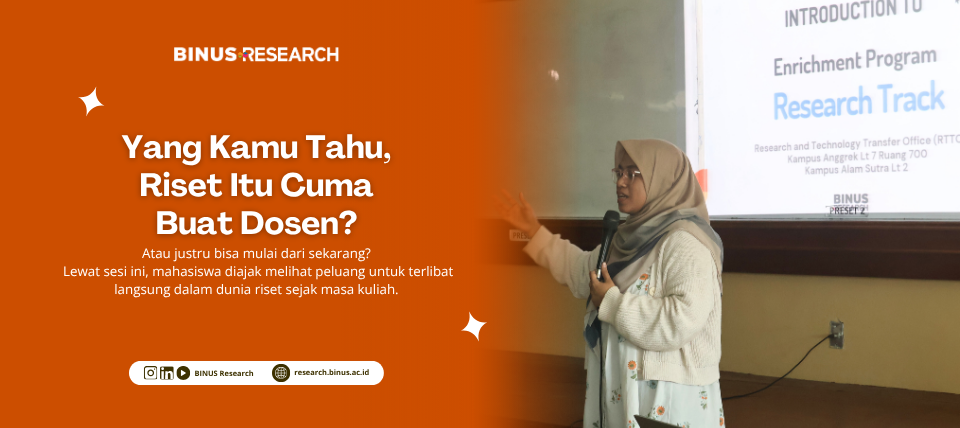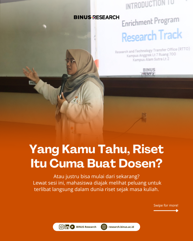 Riset tidak selalu dimulai setelah lulus. Melalui sesi “Ngobrol Bareng Tentang Track Research”, mahasiswa diajak mengenal lebih dekat peluang untuk terlibat dalam dunia riset sejak masa kuliah, khususnya melalui research fellowship track yang diperkenalkan dalam kegiatan ini. Karena kadang, langkah pertama ke dunia riset dimulai dari satu keputusan sederhana.