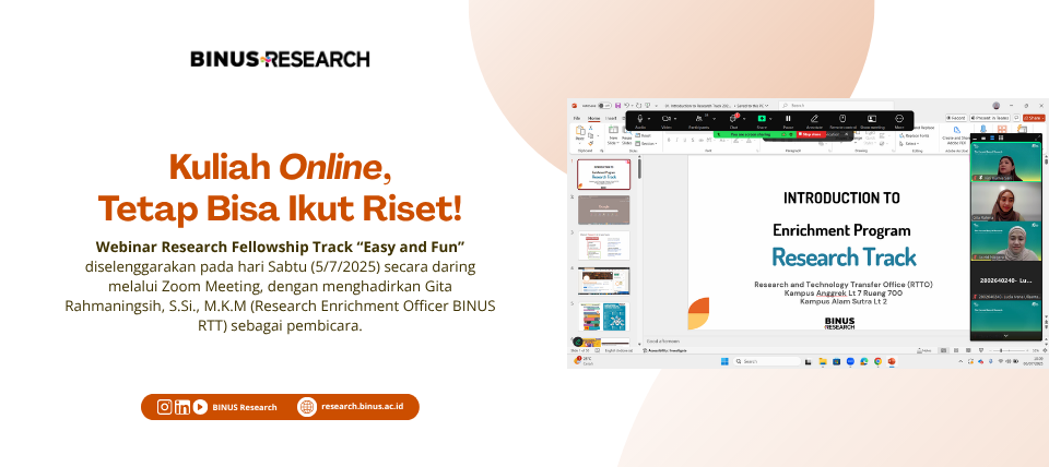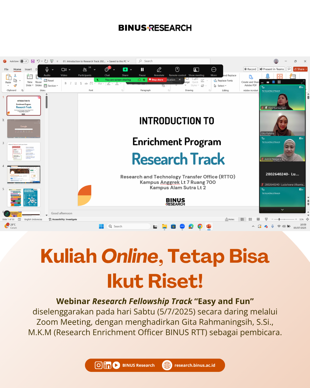 Kesempatan untuk terlibat dalam riset tidak terbatas pada pembelajaran di kelas konvensional. Melalui Webinar Research Track “Easy and Fun”, mahasiswa BINUS Online (BiON) diajak mengenal peluang pengembangan riset selama masa studi melalui Research Fellowship Track sebagai bagian dari enrichment program. Dalam sesi ini, peserta mendapatkan gambaran mengenai Research Fellowship Track untuk mahasiswa BiON, bagaimana keterlibatan dalam kegiatan riset dapat dimulai, serta peluang pengembangan diri yang dapat ditempuh melalui jalur riset selama kuliah.