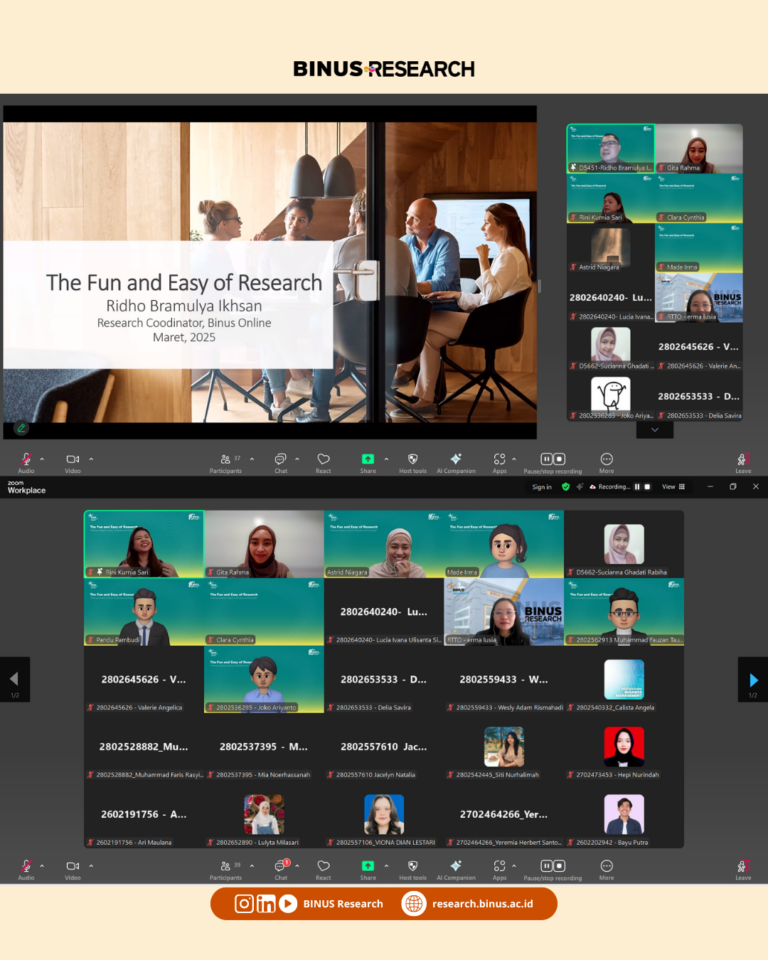 Opportunities to engage in research are not limited to traditional classroom settings. Through the Webinar Research Track “Easy and Fun”, BINUS Online (BiON) students were introduced to research development opportunities during their studies through the Research Fellowship Track as part of the enrichment program. The session provided an overview of the Research Fellowship Track for BiON students, how students can begin their involvement in research activities, and the opportunities for personal development through research pathways.
