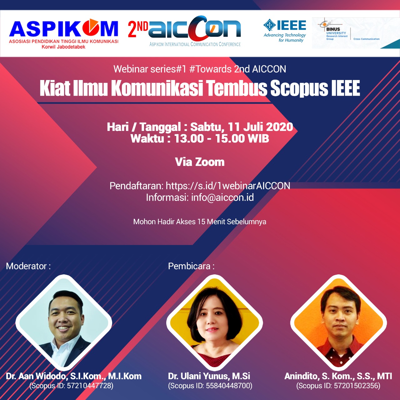 JAKARTA – Menyongsong penyelenggaraan Asosiasi Pendidikan Tinggi Ilmu Komunikasi (ASPIKOM) International Communication Conference (2nd AICCON) pada 8-9 Februari 2021, ASPIKOM Korwil Jabodetabek menggelar webinar series 1 Toward 2nd AICCON bertemakan “Kiat Ilmu Komunikasi Tembus Scopus IEEE” Sabtu, (11/7) melalui aplikasi zoom dan YouTube. Webinar yang di ikuti 200 lebih peserta dari berbagai daerah ini menampilkan pembicara Dr Ulani Yunus, Dosen Binus University yang juga Ketua Panitia 2nd AICCON, Anindito, MTI, Dosen Binus University dan bertindak sebagai moderator Dr Aan Widodo, Dekan Fakuktas Ilmu Komunikasi Universitas Bhayangkara Jakarta Raya.